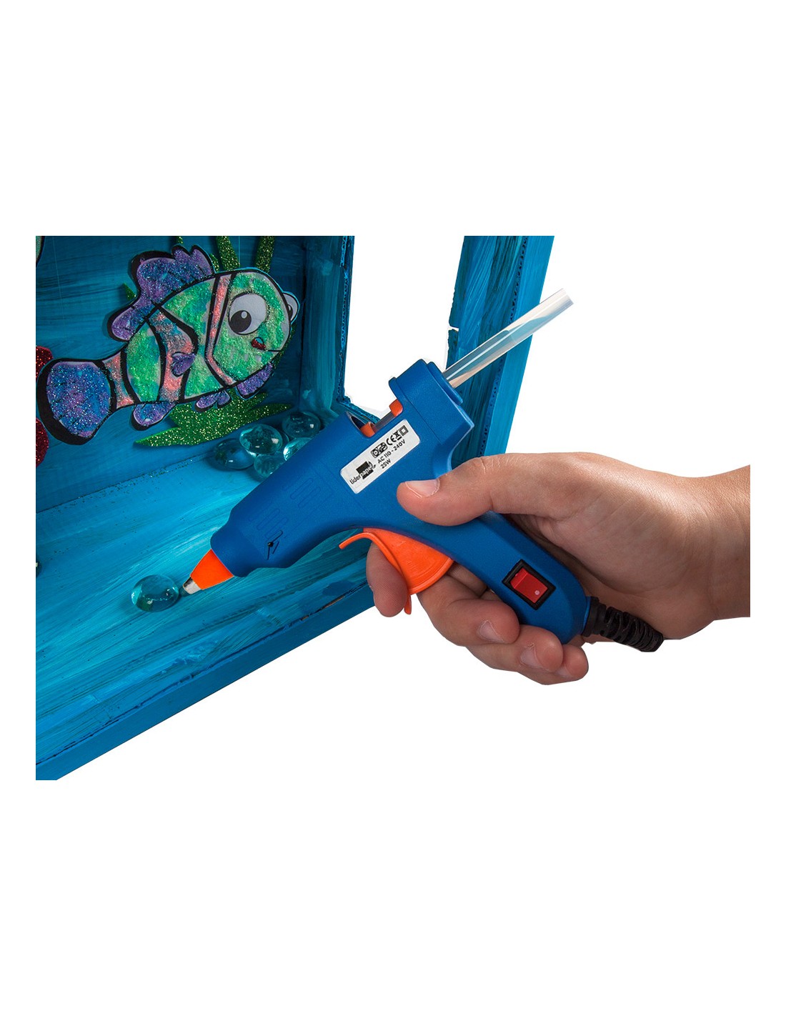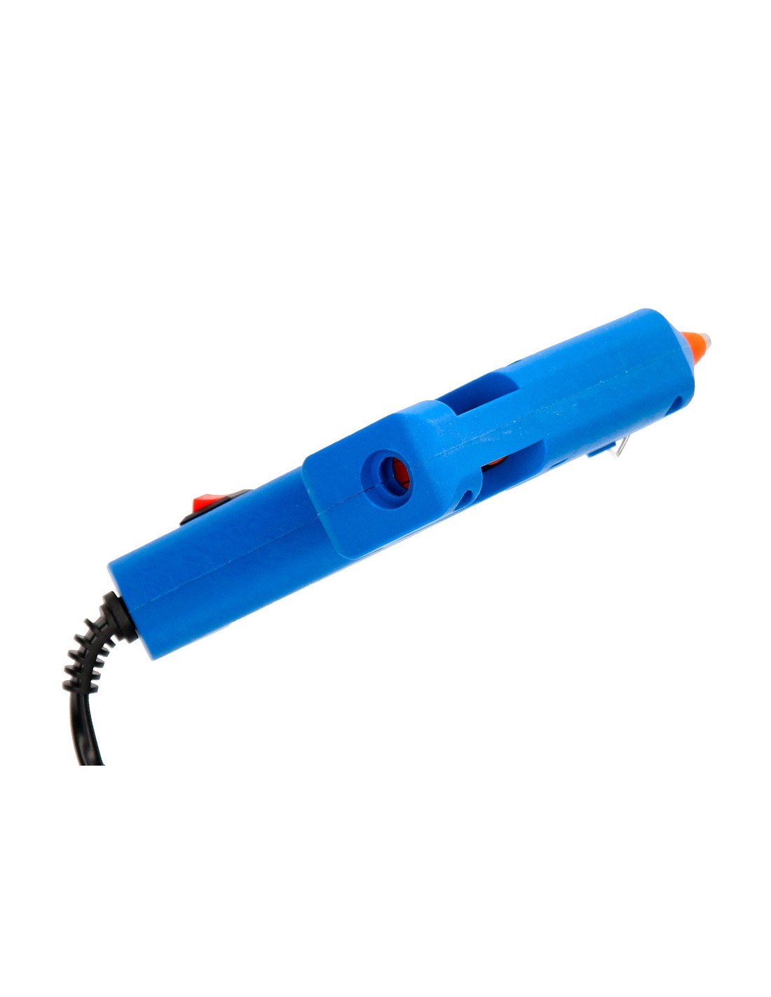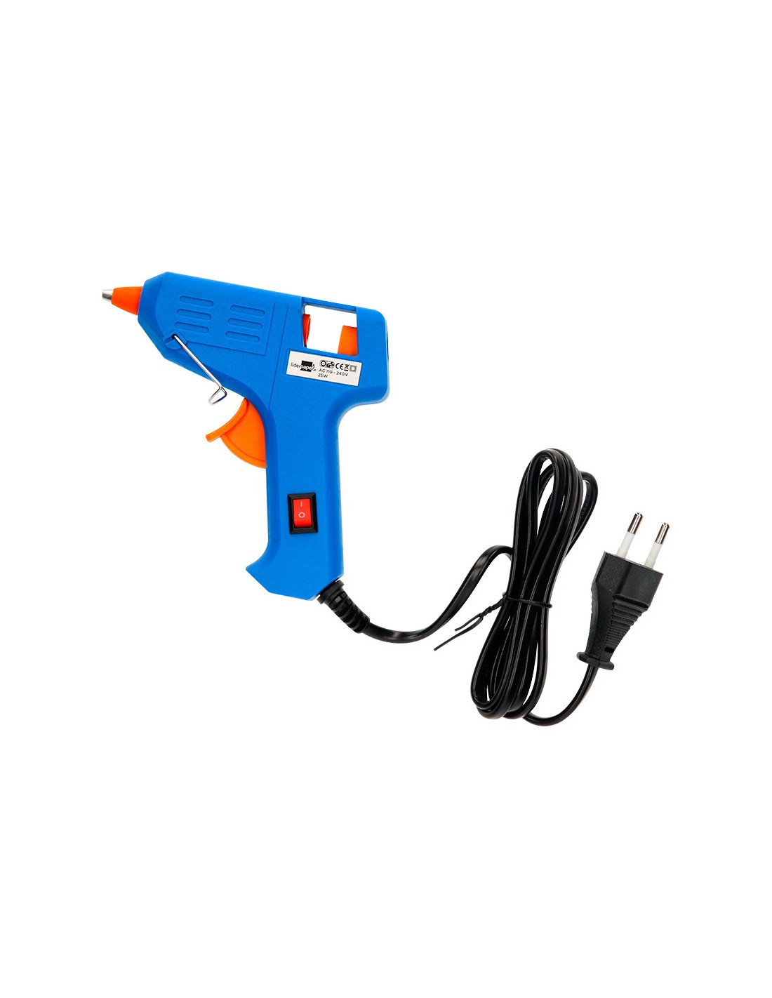 Pistola termofusible tamaño mini. Ideal para realizar trabajos manuales. Uso escolar. Potencia 25 W. Incluye 2 barras sólidas de 100 mm de largo x 7 mm de diámetro. Medidas 133 x 128 mm.