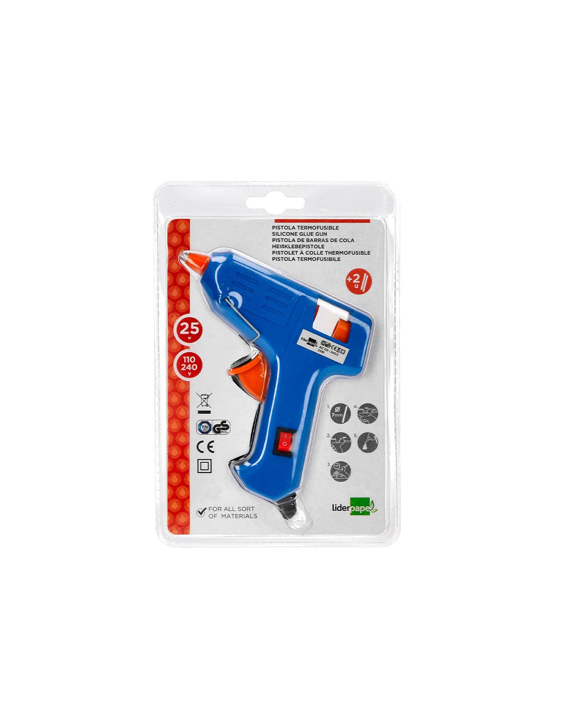 LIDERPAPELPistola termofusible mini liderpapel de 25w con gatillo dispensador y 2 barras de repuesto de 7 mm diametro x 100 mm