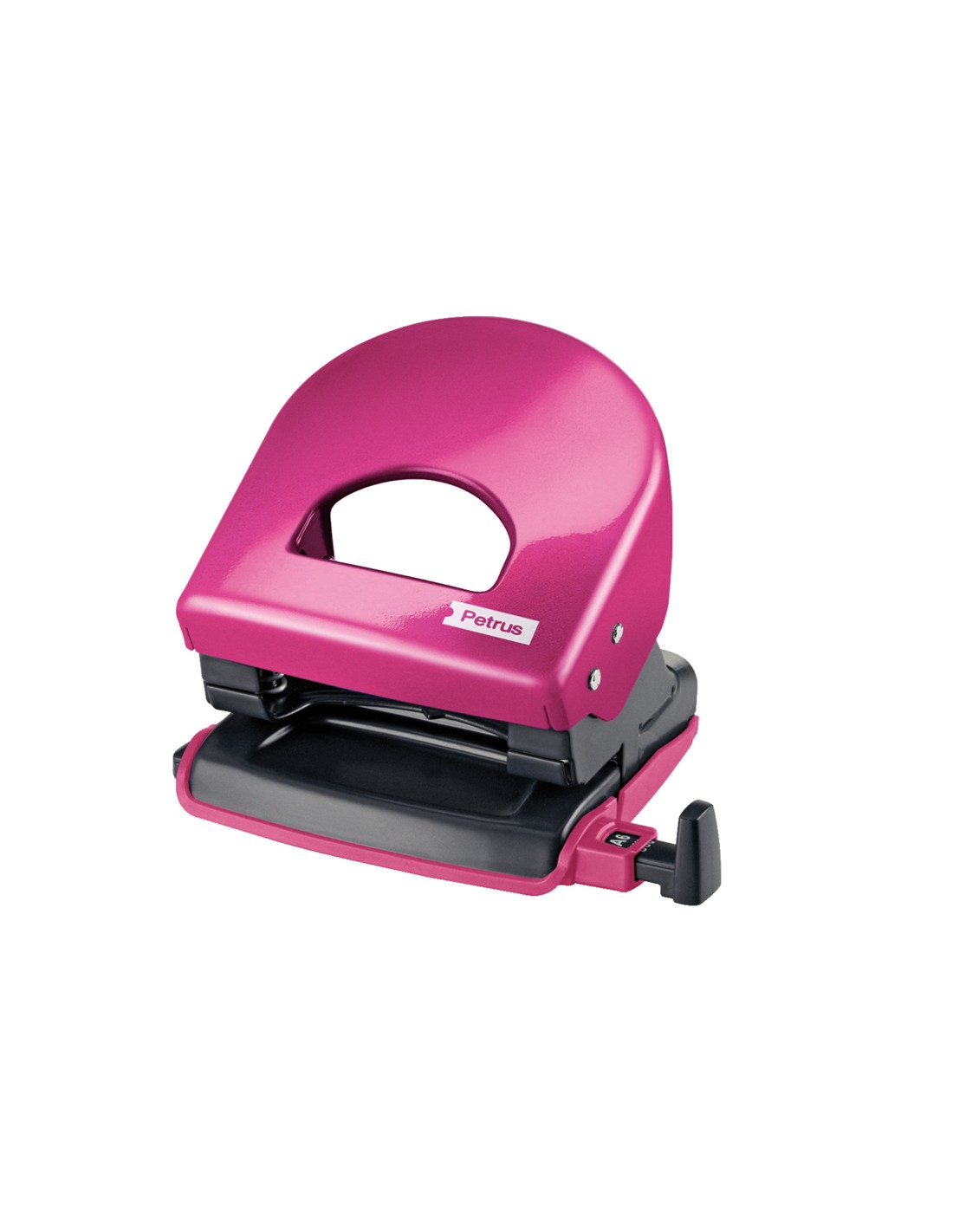 Taladro de metal en colores actuales para uso cotidiano. Con base antideslizante de plástico. Robusto y fiable. Zona de sujeción patentada y punzones afiladísimos que reducen el esfuerzo. Regleta tope para alinear el papel con formatos impresos y ventana para mejor visibilidad y fijación. Distancia entre punzones 80 mm. Capacidad de perforación 3 mm/ 30 hojas. Medidas de la base 135 x 104 mm.