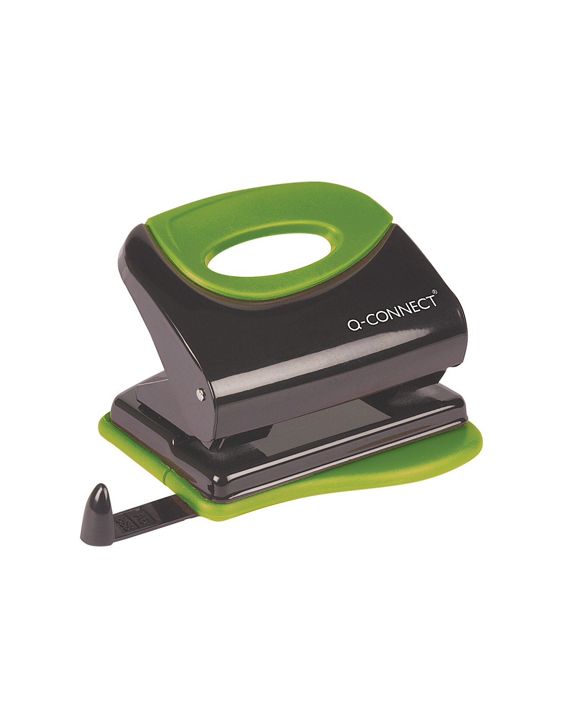 Taladrador metálico con empuñadura verde de caucho antideslizante. Con regleta tope para alinear el papel. Diseño en atractivos colores. Medidas de la base 117 x 105 mm.