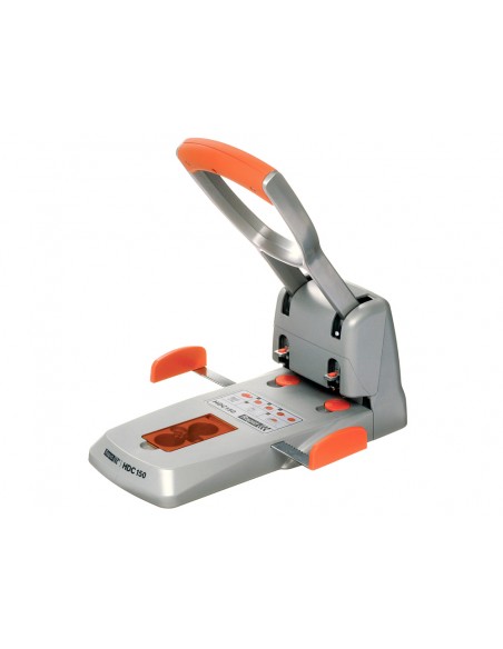Taladro de dos agujeros con palanca ergonómica de goma de fácil sujeción que requiere menos esfuerzo. Se puede utilizar en casa, en el colegio o en la oficina. Capacidad para hacer 4 agujeros con la posición 88 en la barra guía. Diámetro del taladro 5,5 mm. Capacidad de perforación hasta 150 hojas. Color combinado plata/naranja. Medidas 192 x 204 x 387 mm.