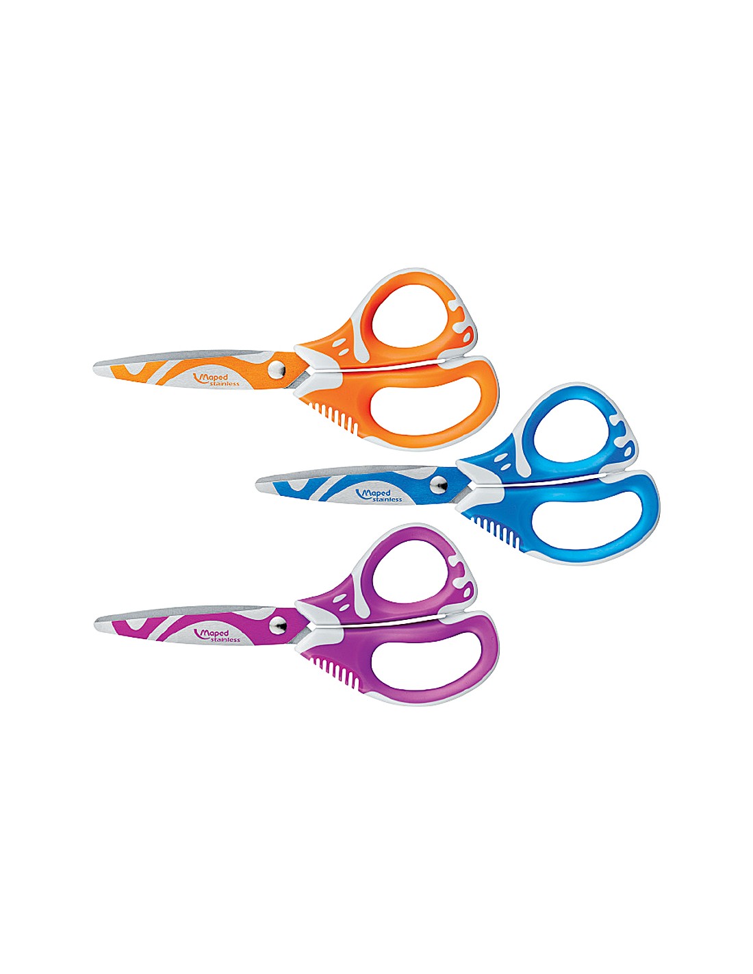 Sistema amortiguador antidolor gracias al material flexible del interior de las anillas. Puntas redondeadas. Hojas de acero inoxidable decoradas. Longitud 13 cm.
