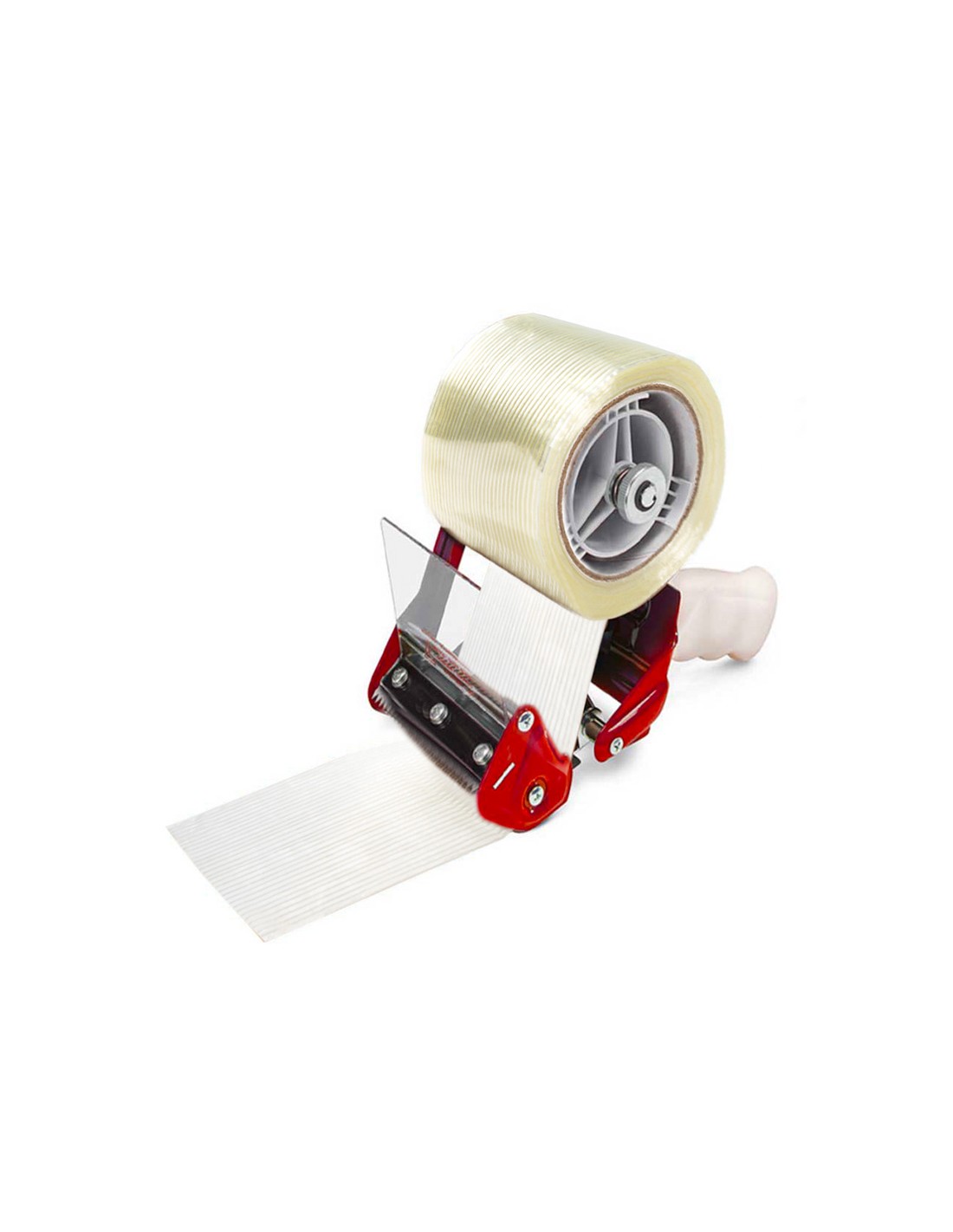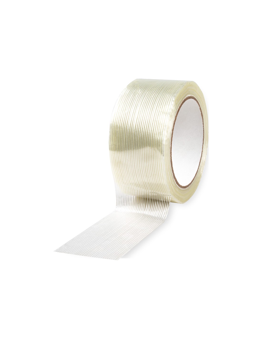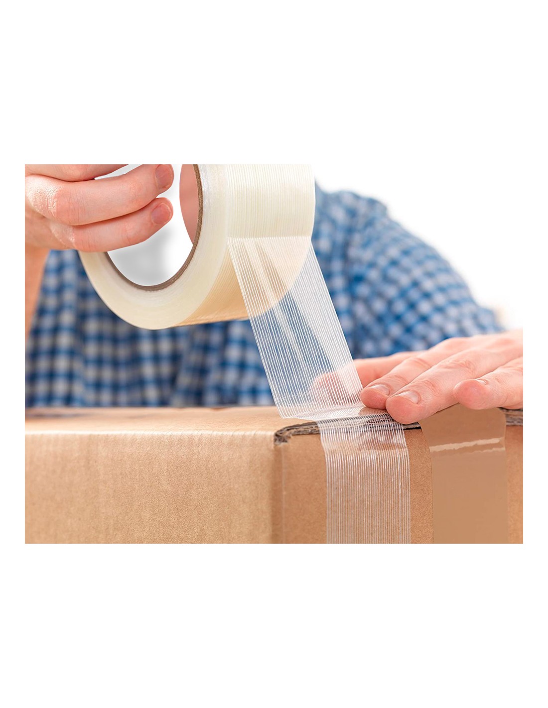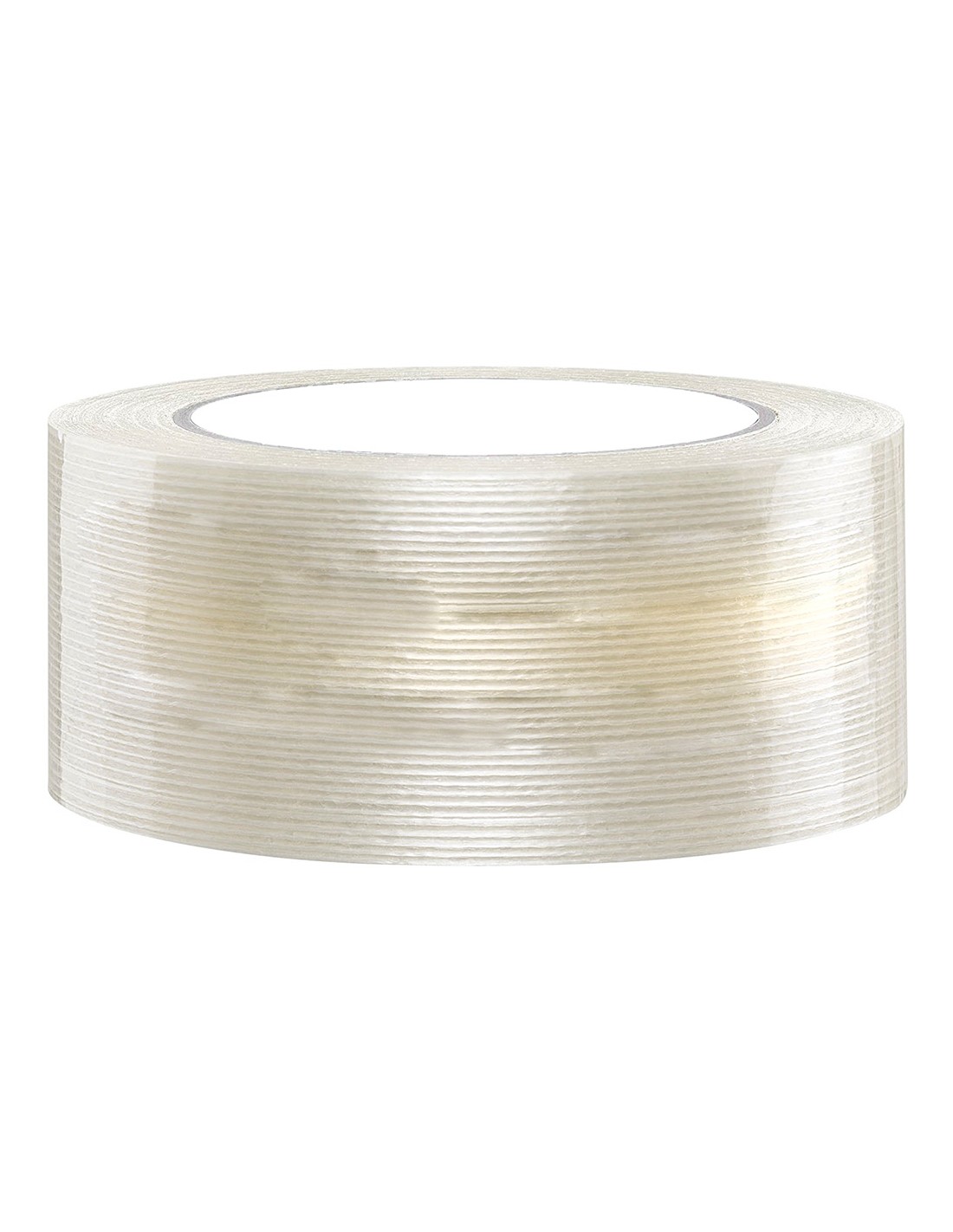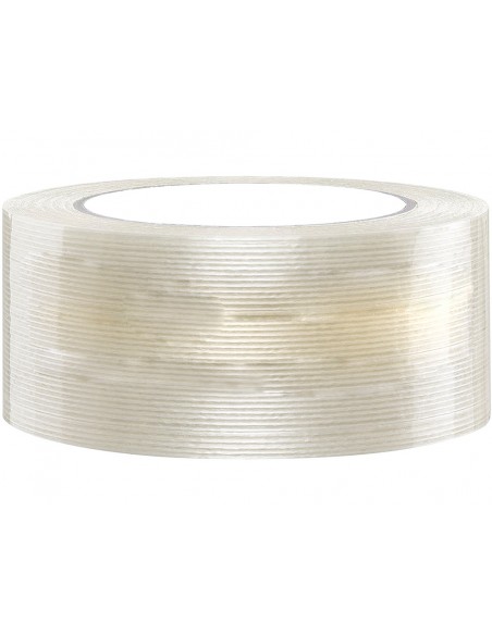 Cinta adhesiva de caucho sintético transparente. Especial para embalaje de productos muy pesados o riesgosos. Reforzado con filamentos de fibra de vidrio para una mejor resistencia. Medidas 50 m x 50 mm.