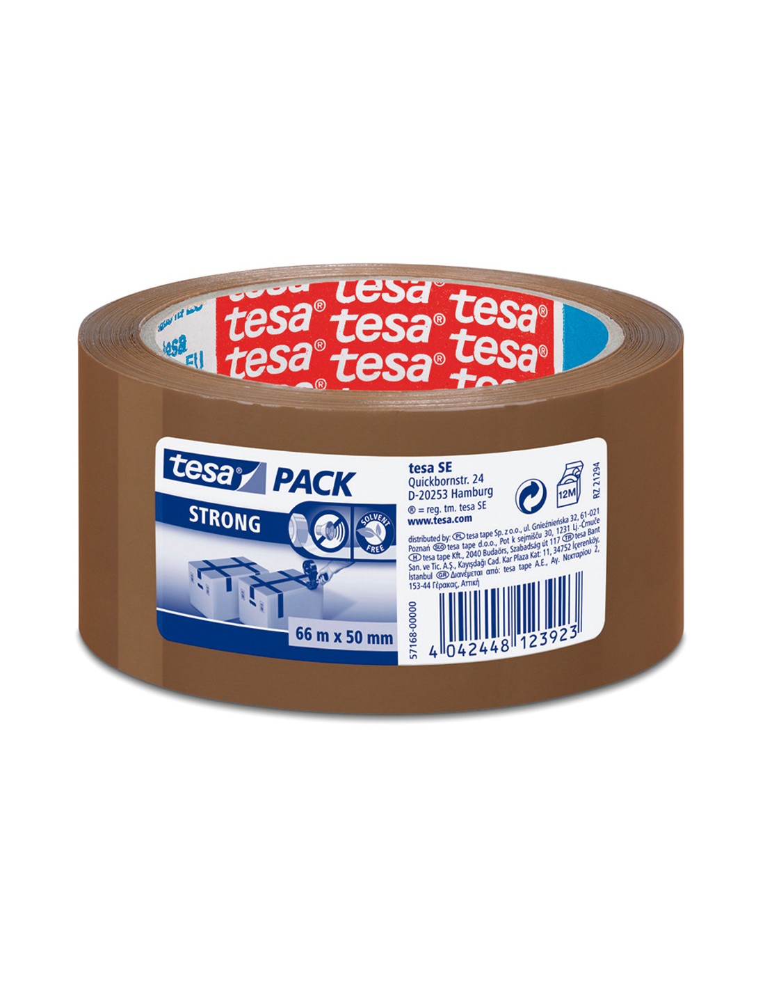 Cinta especial para embalaje. Indicada para sellar cartones, cajas y sobres de peso medio. Fuerte adhesión. Desbobinado silencioso. Adhesivo sin disolventes con alta resistencia a los rayos UV. Apta para dispensadores tesaPack®. Medidas 66 m x 50 mm. 52 micras.