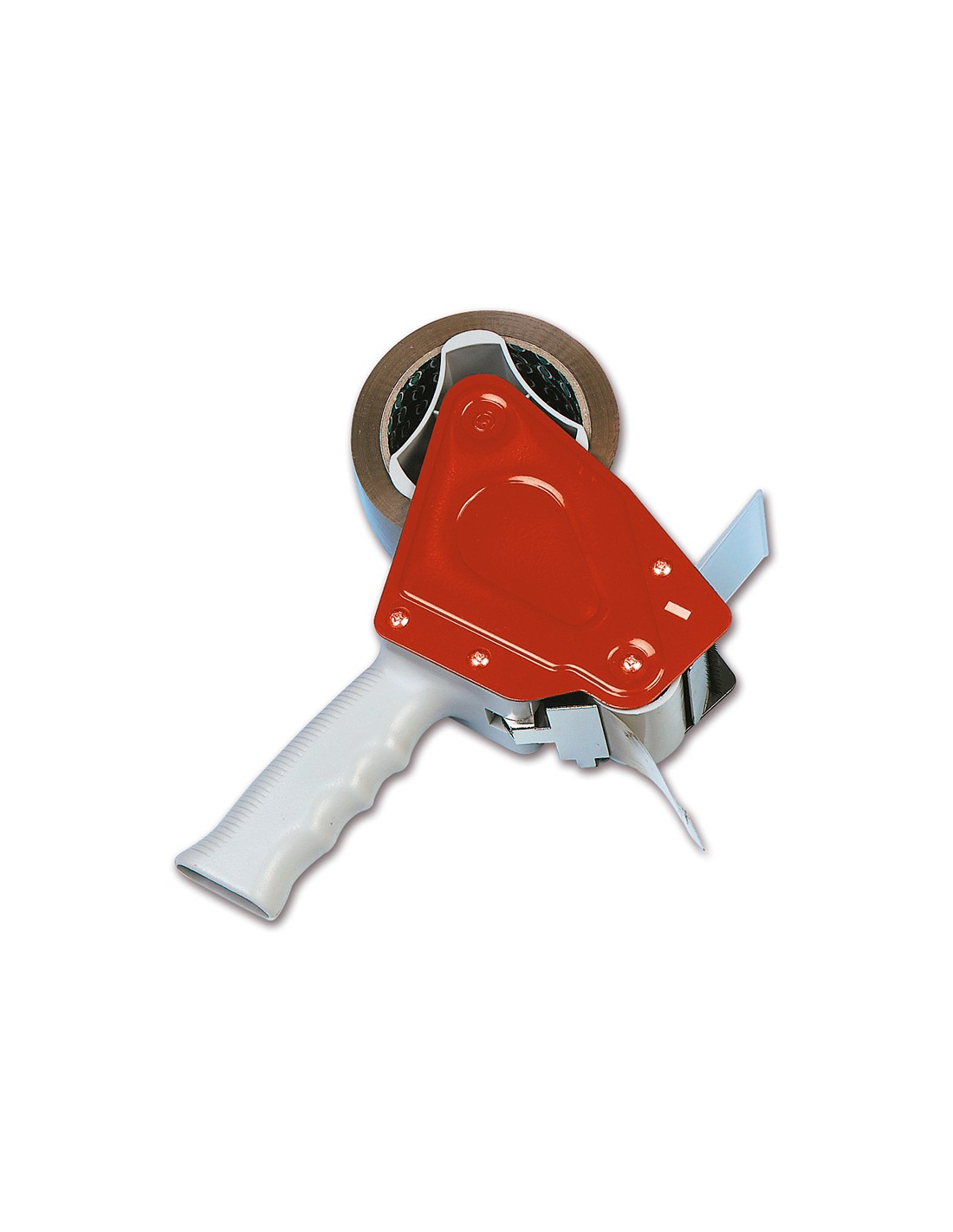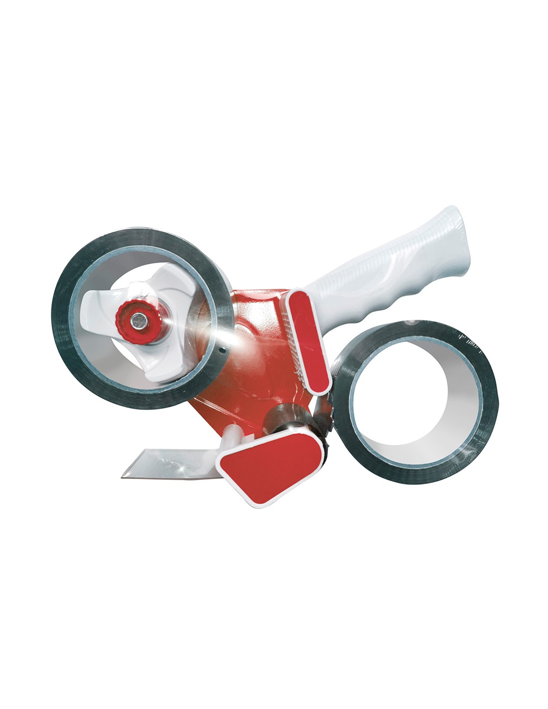 Dispensador para cinta de embalaje de 50 mm de ancho, con mango rígido. Ideal para un uso continuado. Incluye dos rollos de cinta adhesiva de color marrón de 66 m x 50 mm.