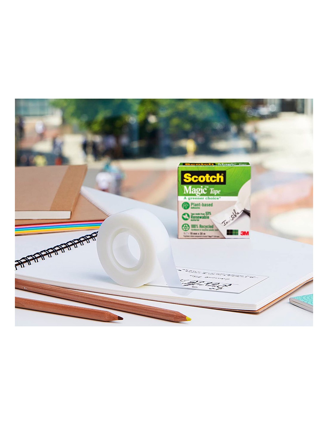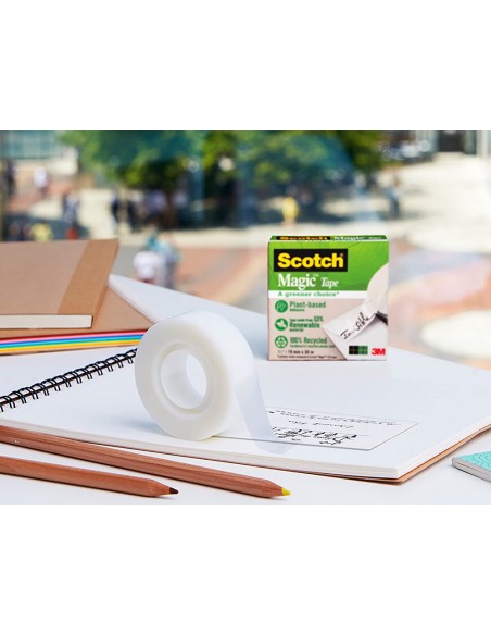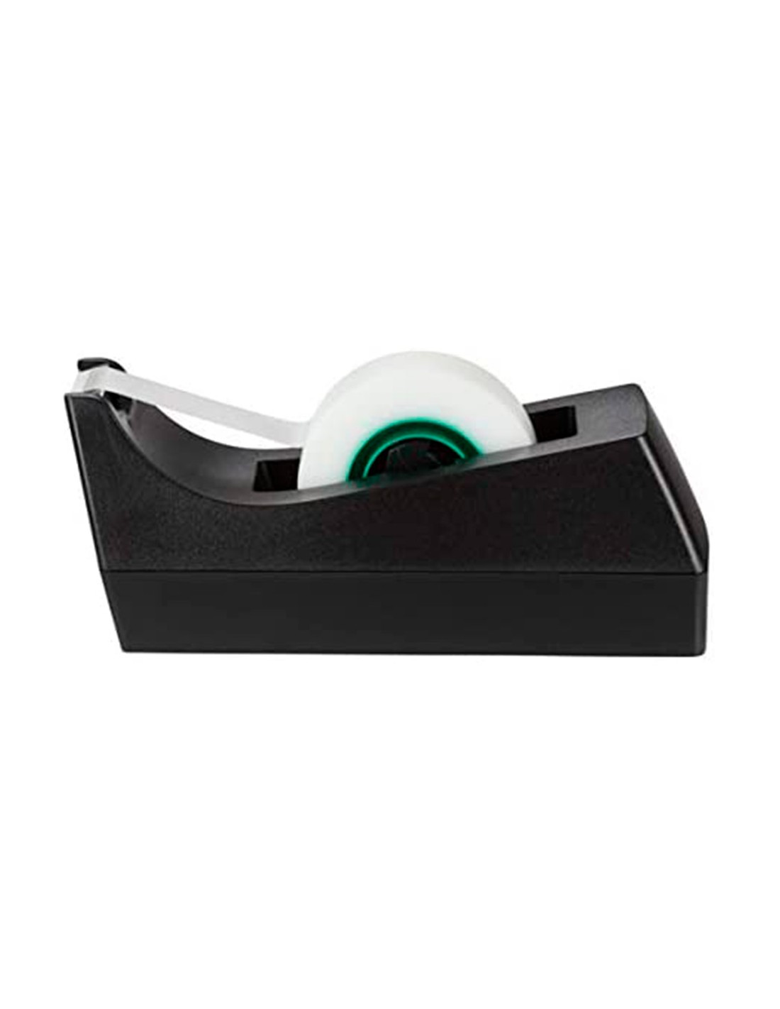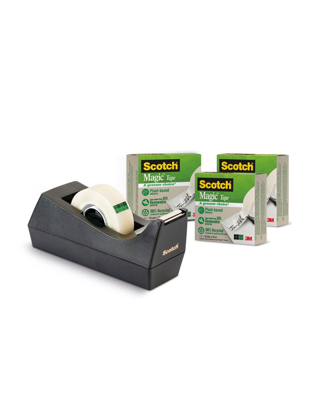 Portarrollos negro fabricado en plástico 100% reciclado. Para cintas de hasta 33 m. Base antideslizante. Pack de portarrollos + 3 cintas Scotch Magic 900 de 33 m x 19 mm. Medidas 69 x 165 x 69 mm.