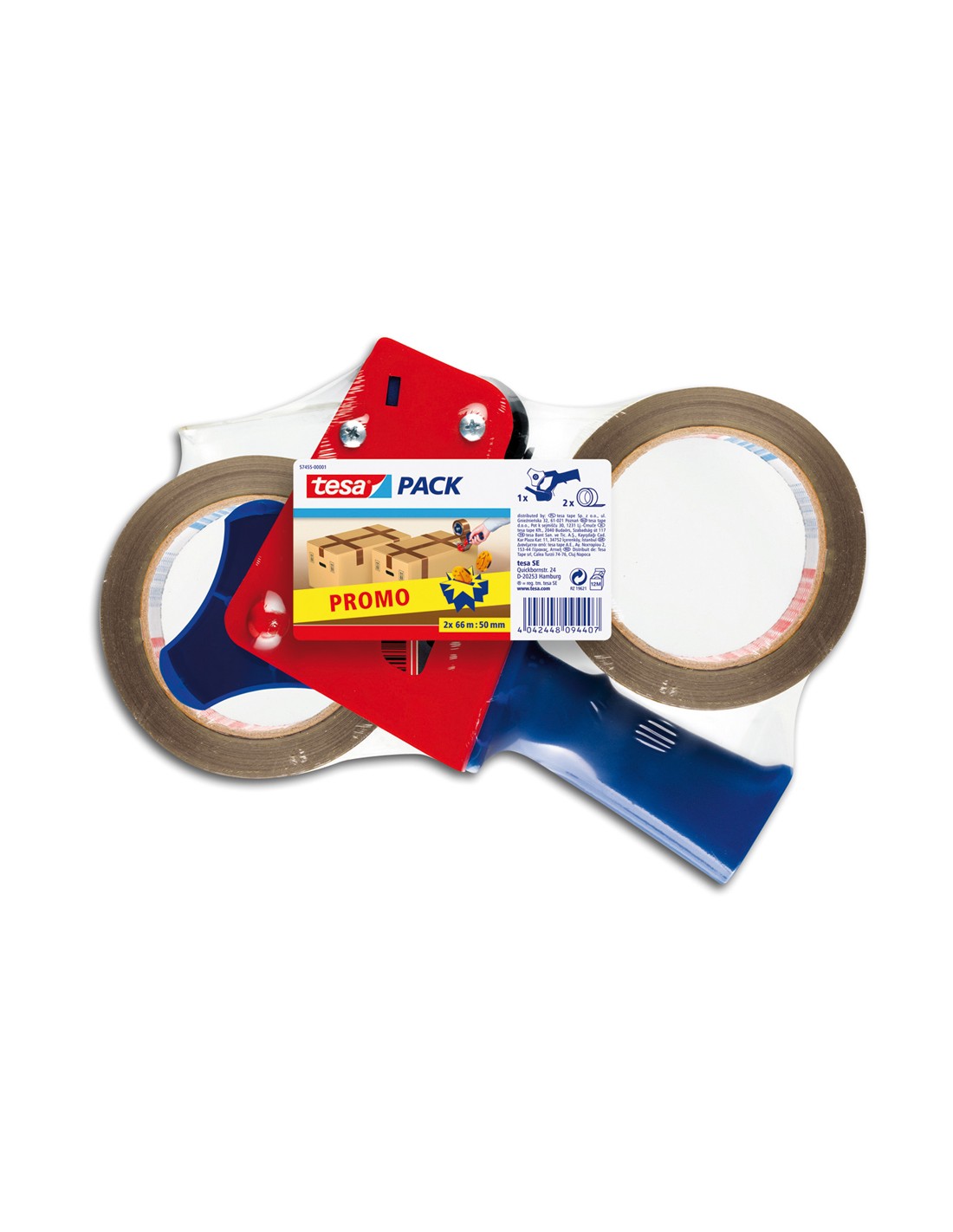Dispensador para cinta de embalaje con mango rígido. Incluye dos rollos color marrón de 66 m x 50 mm.