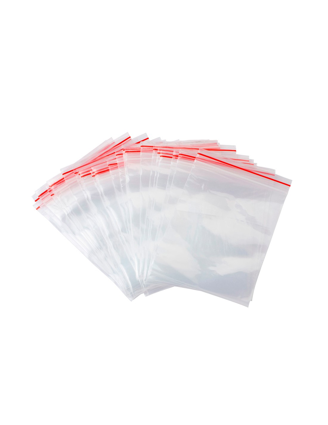 Bolsas fabricadas en plástico con sistema de autocierre por presión fáciles de volver a sellar. Color transparente con una línea roja y una perforación de 6 mm sobre el sello. Ideales para almacenar pequeños suministros de oficina o incluso alimentos. Grosor 50 micras.