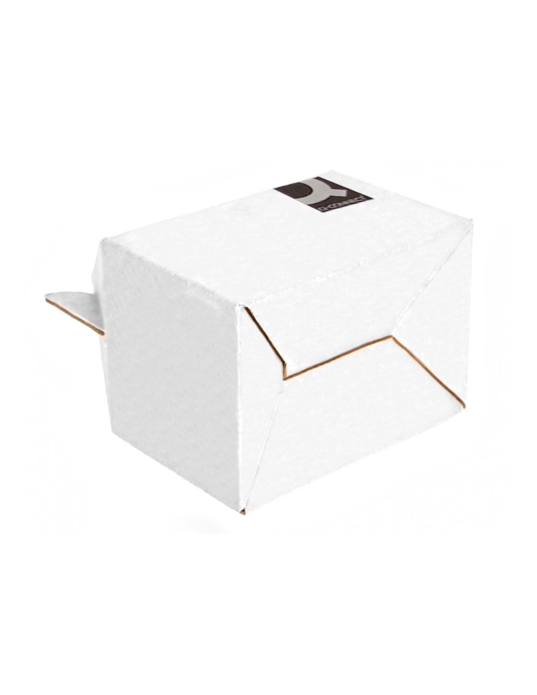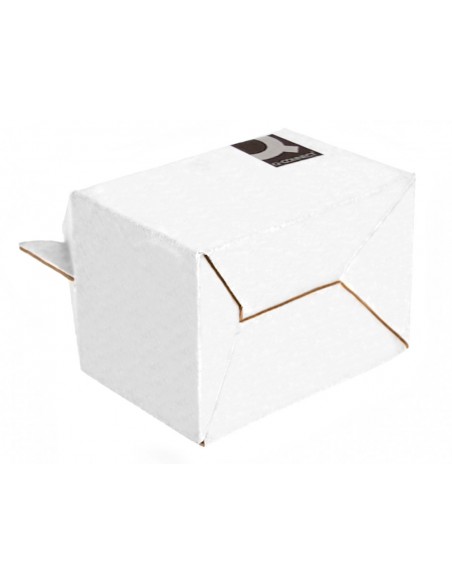 Caja para embalar tipo maletín con fondo automontable. Gran resistencia. Con asa para transporte. Indicada para la protección, envío y transporte de objetos. Color blanco. Fabricada en cartón simple de 3 mm de espesor. Medidas 355 x 258 x 120 mm.