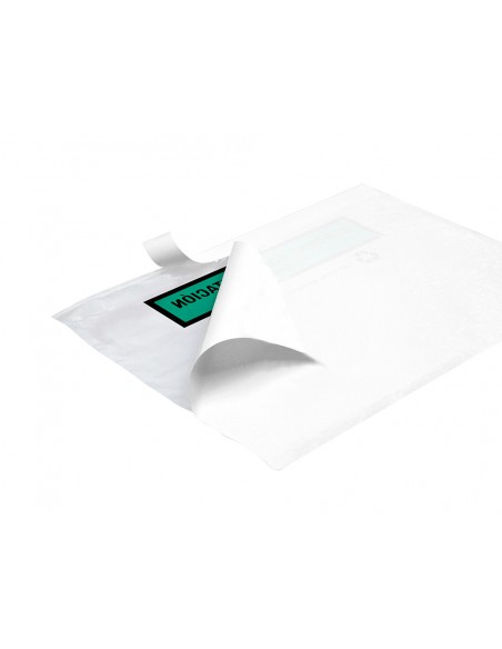 Sobre autoadhesivo Q-Connect porta documentos multilingüe 240 x 180 mm. sin ventana paquete de 100 unidades. Sobre autoadhesivo para el envío de documentos. Texto en inglés. Totalmente transparente, sin ventana, con impresión en negro y verde. Fabricado 100% con papel, no contiene plástico.