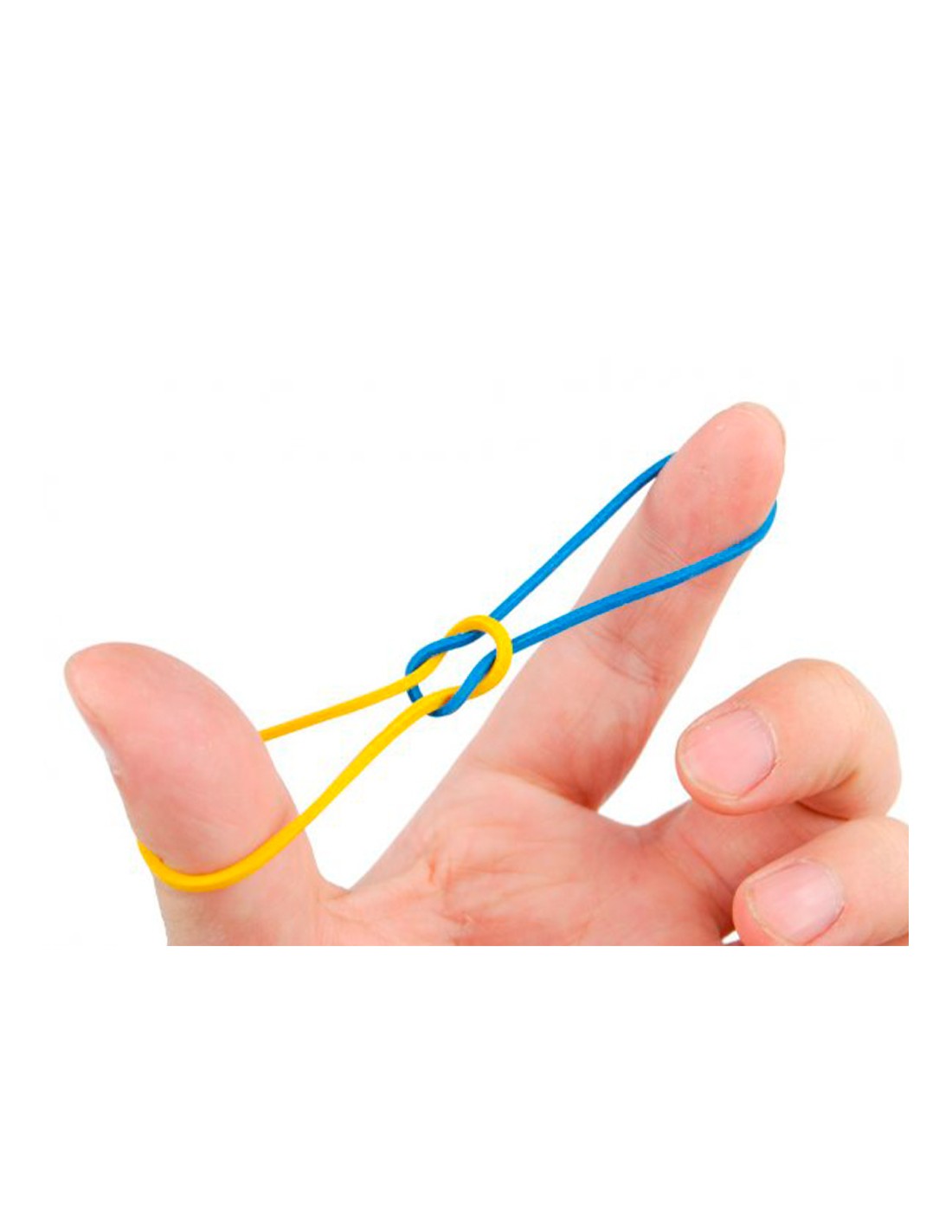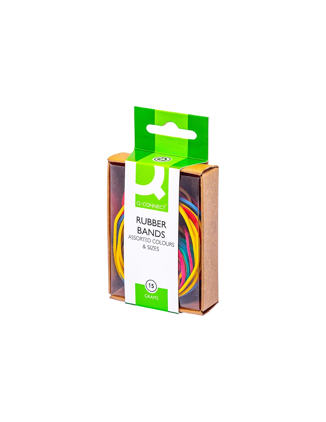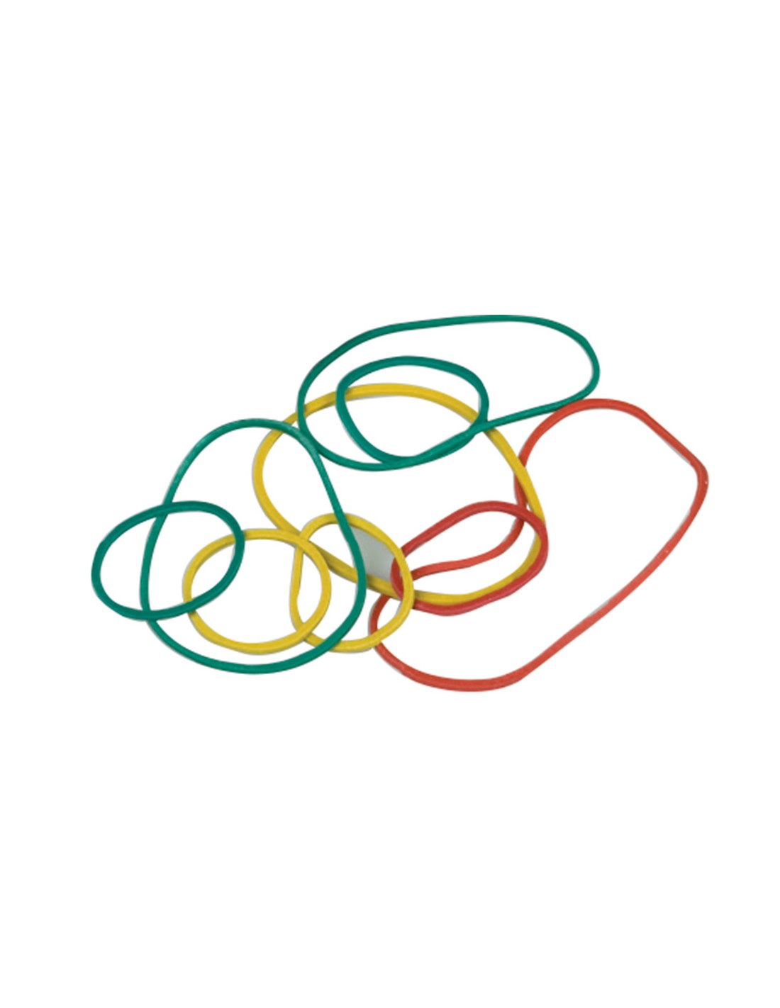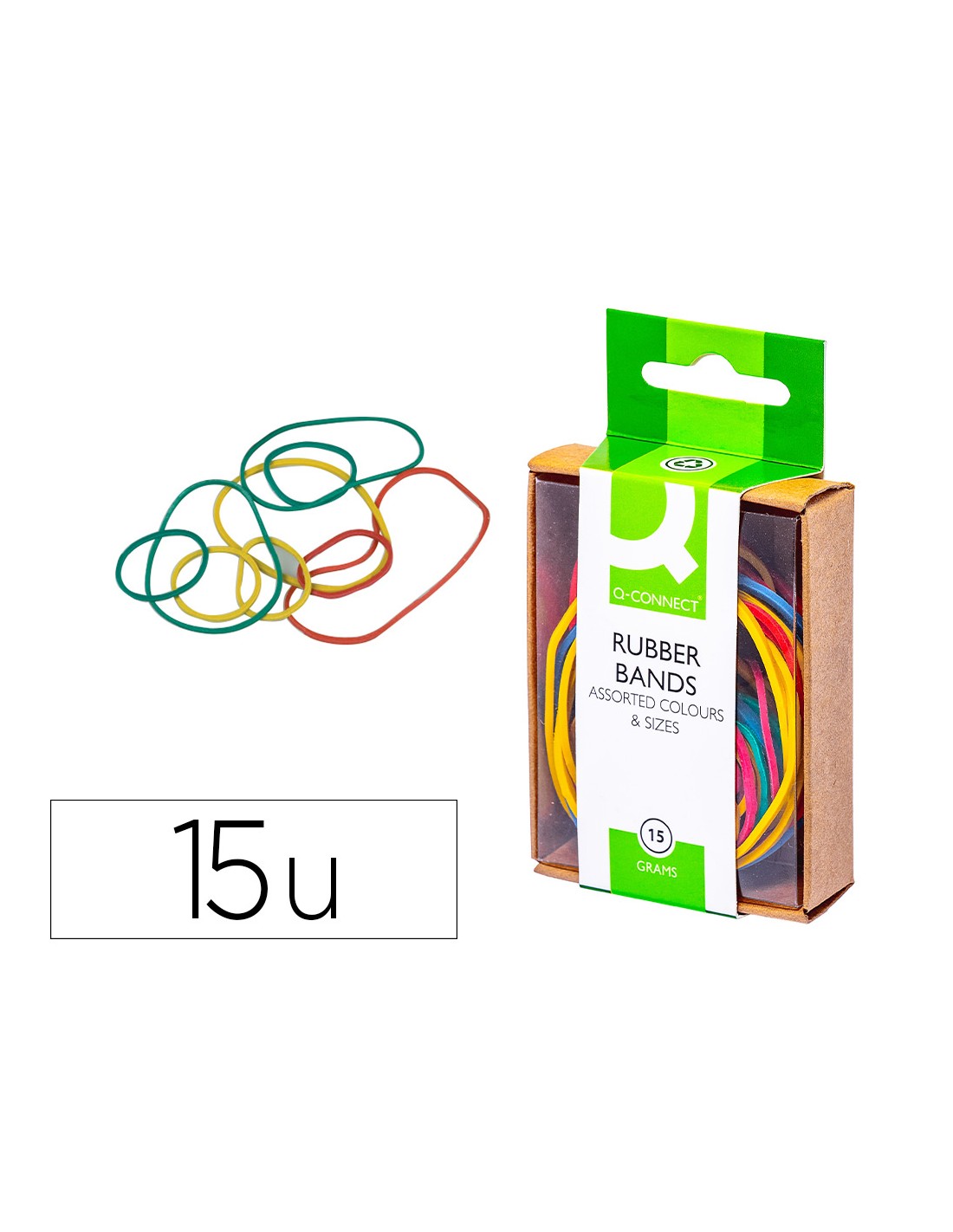 En caja de plástico rígido de 15 g. Gomillas surtidas del nº 8 (8 cm) y del nº 4 (4 cm).