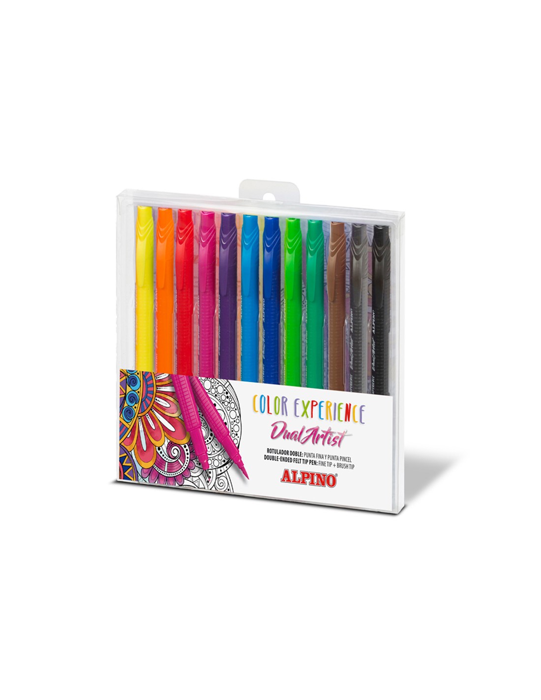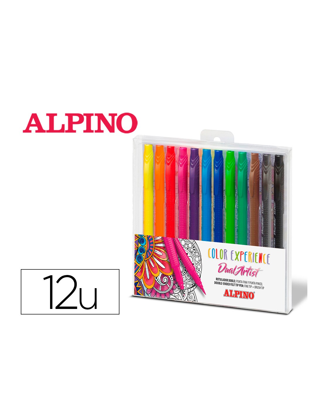 Rotuladores Alpino Color Experience de doble punta. Forma triangular, ergonómico y de cómodo agarre. Doble punta en el mismo marcador, permite dibujos más completos con un mismo rotuladorpunta fine liner de 0,7 mm, perfecta para dibujar y perfilar. Punta pincel de 2,9 mm, ideal para lettering ycolorear dibujos. Caja de 12 unidades colores surtidos.