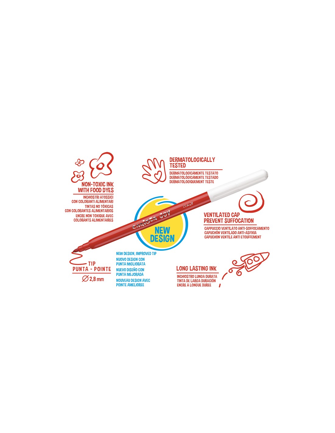 Punta de nylon de 2,6 mm de diámetro. Tinta a base de agua y colorantes alimentarios inocuos y lavables. Punta bloqueada. Permite hasta 800 m de escritura. Sin gluten.
