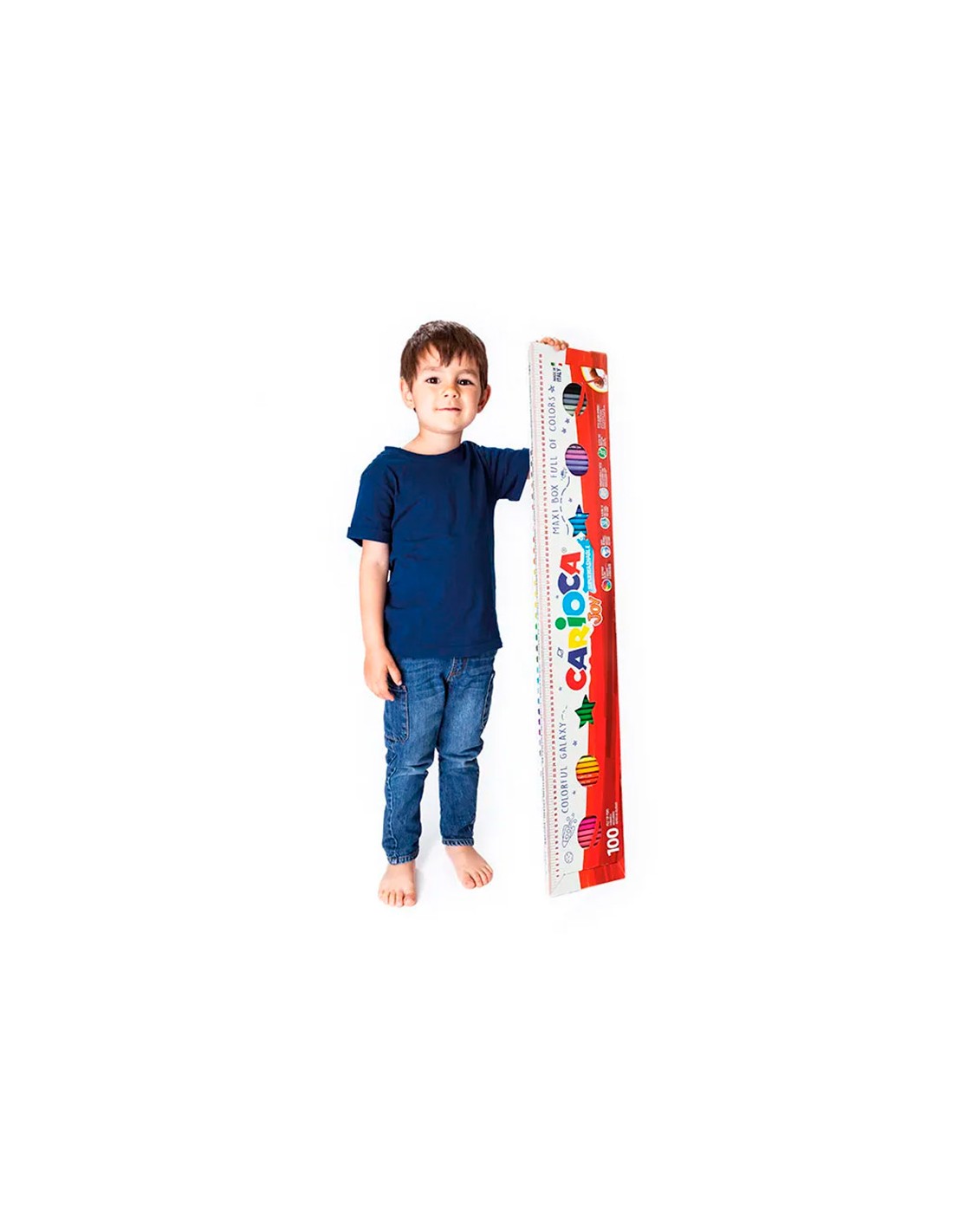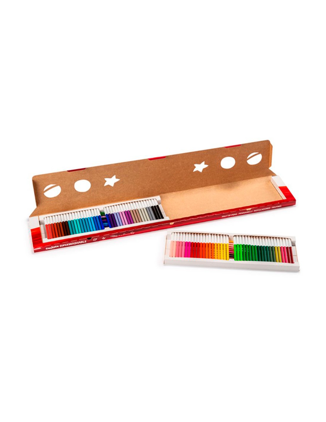 ¡Un metro de creatividad! Maxi caja con 96 rotuladores colores surtidos depunta fina para trazos precisos. Tinta superlavable no toxica, facil de l avar de la piel con agua y sin jabon. La caja contiene por detras un portalápices para recortar y colorear.