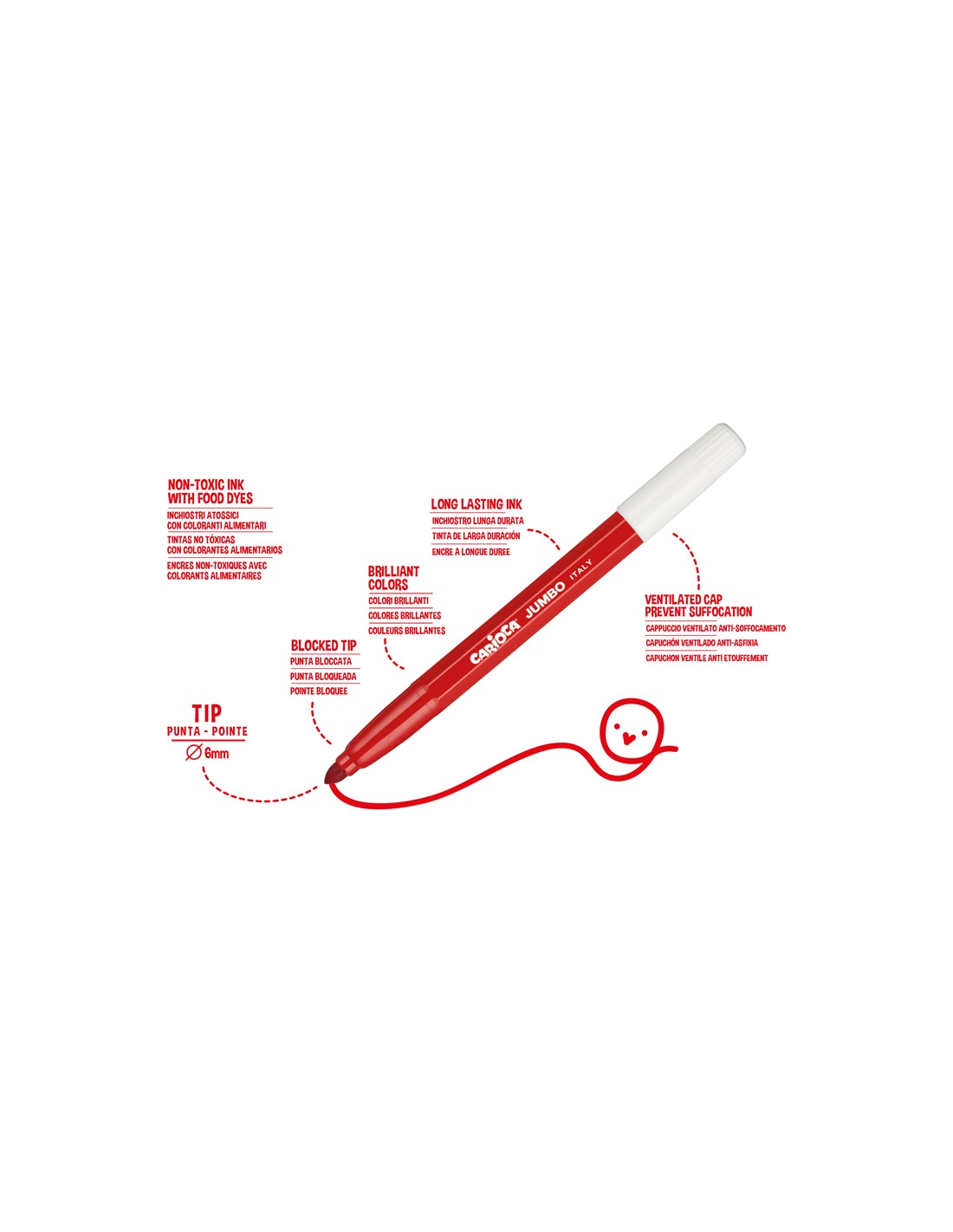 Apto para el uso escolar. No recomendado para menores de 3 años. Punta gruesa. Diámetro 6 mm. Sin gluten. Lavable. Punta bloqueada.