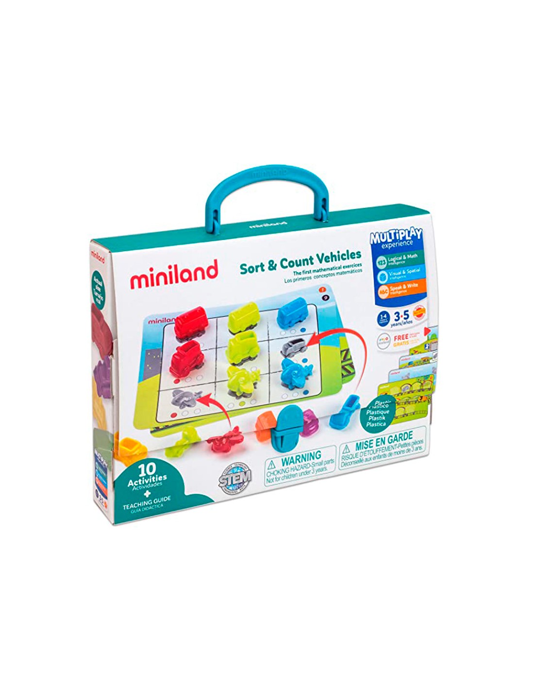 Juego miniland 36 vehiculos y 5 fichas de actividad a doble cara para logica matematica 310x70x531 mm