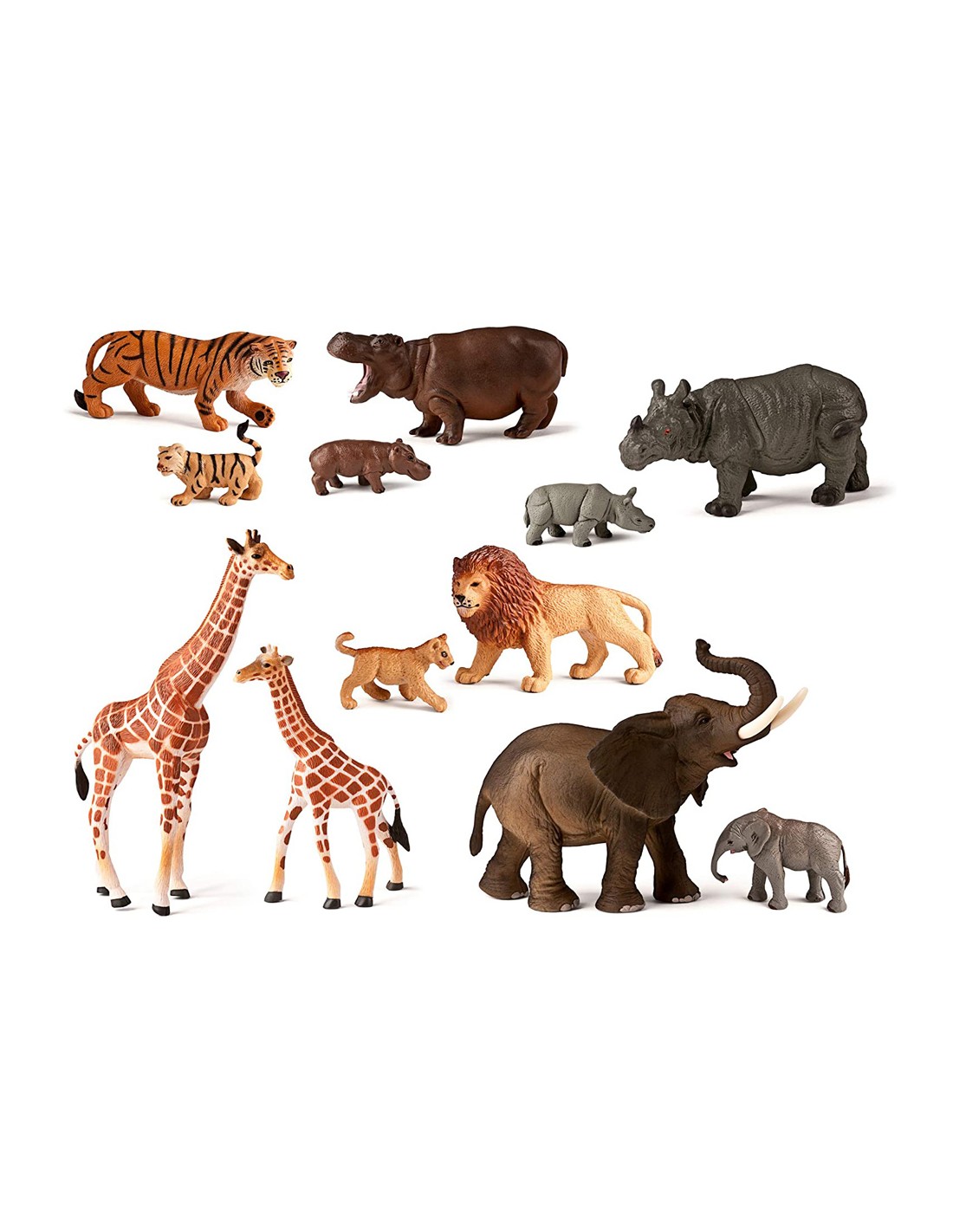Contenido jirafa con cría, león con cachorro, elefante con cría, tigre con cría, hipopótamo con cría, rinoceronte con cría y 1 guía didáctica.