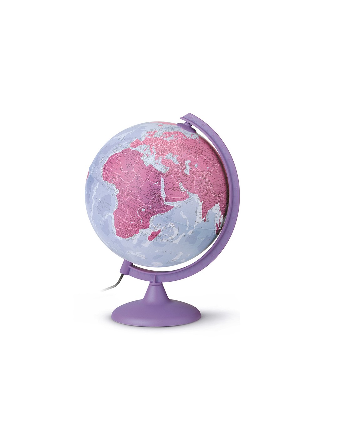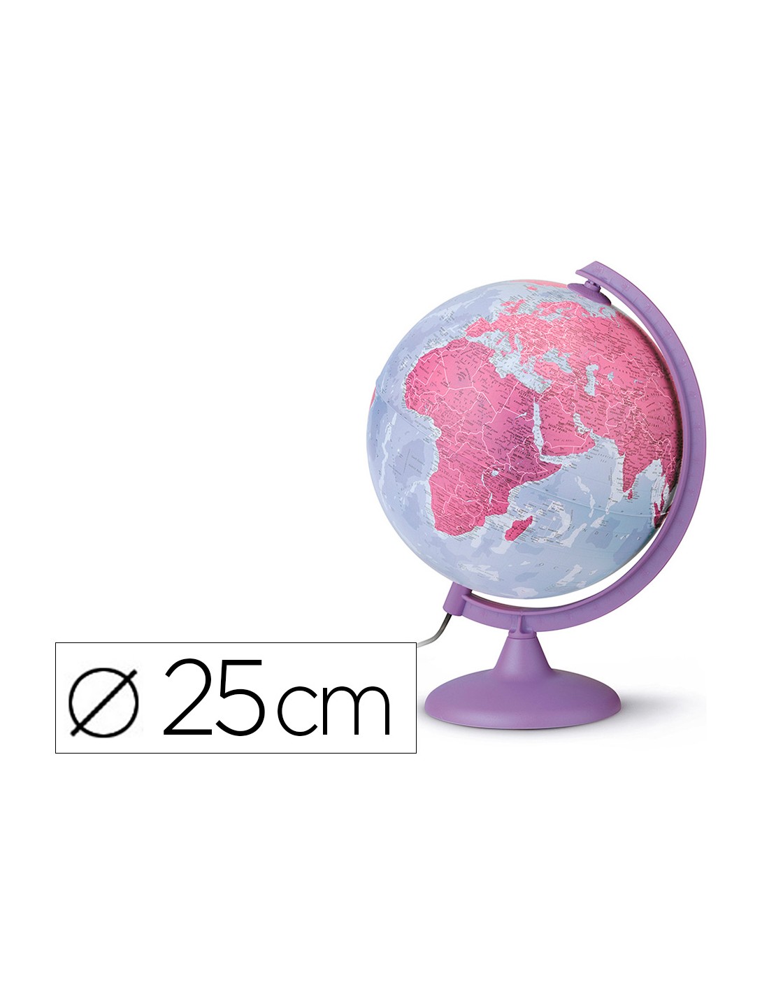 Esfera Purple de 25 cm de diámetro. Base y meridiano de plástico color morado. Con luz. Cartografía coloreada.