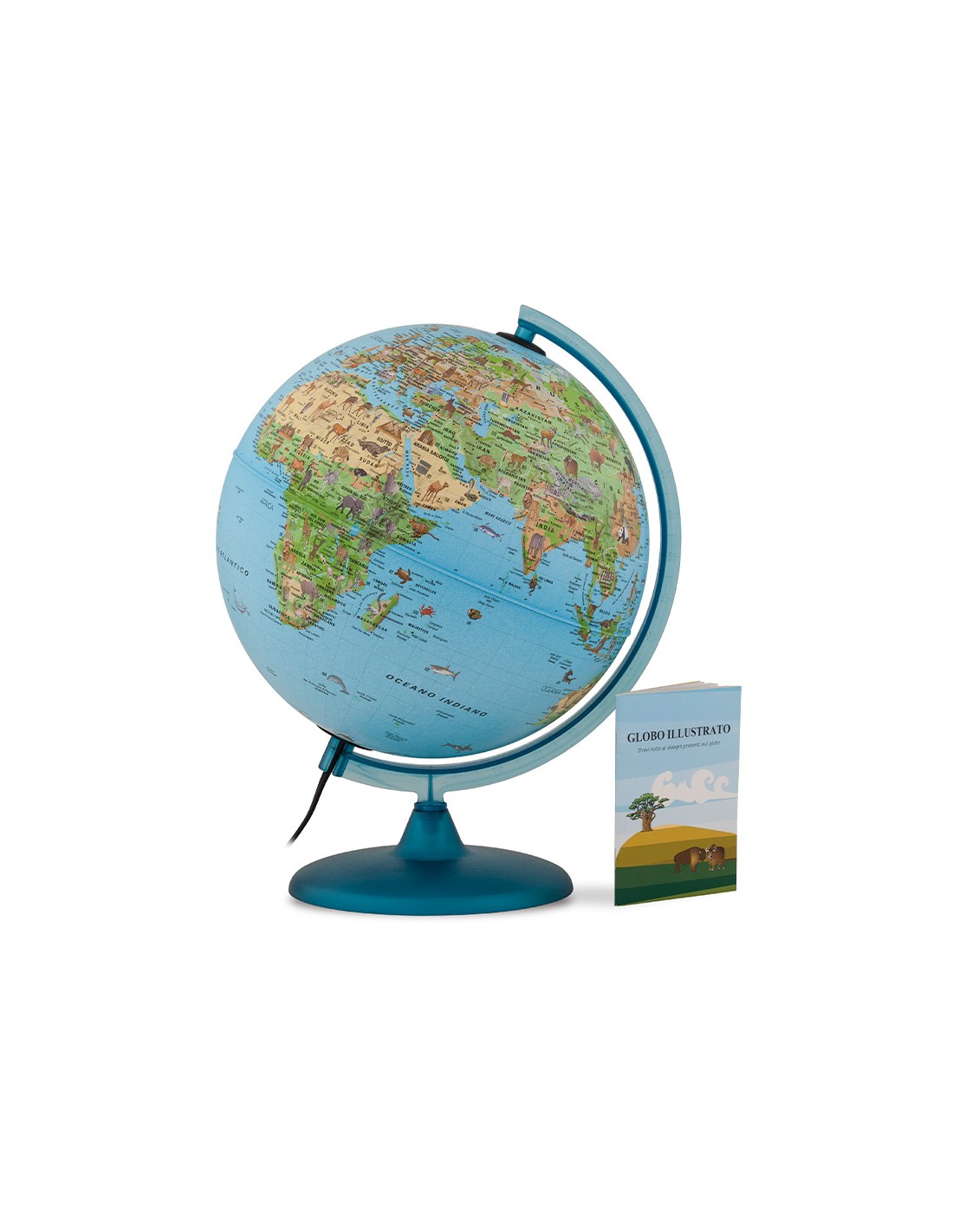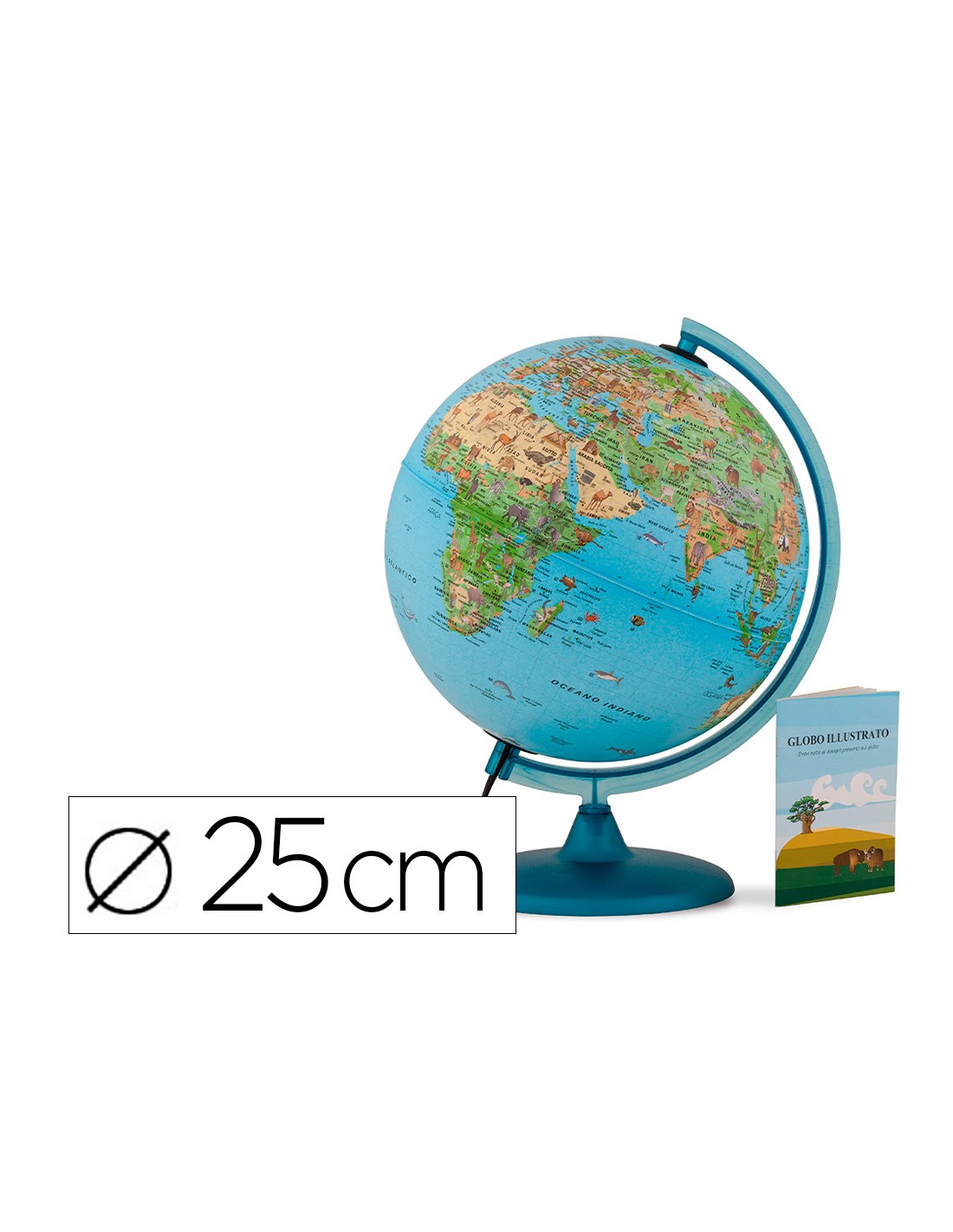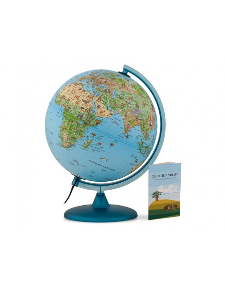 Esfera Safari de 25 cm de diámetro. Base y meridiano de plástico color azul. Con luz. Cartografía ilustrada con animales.