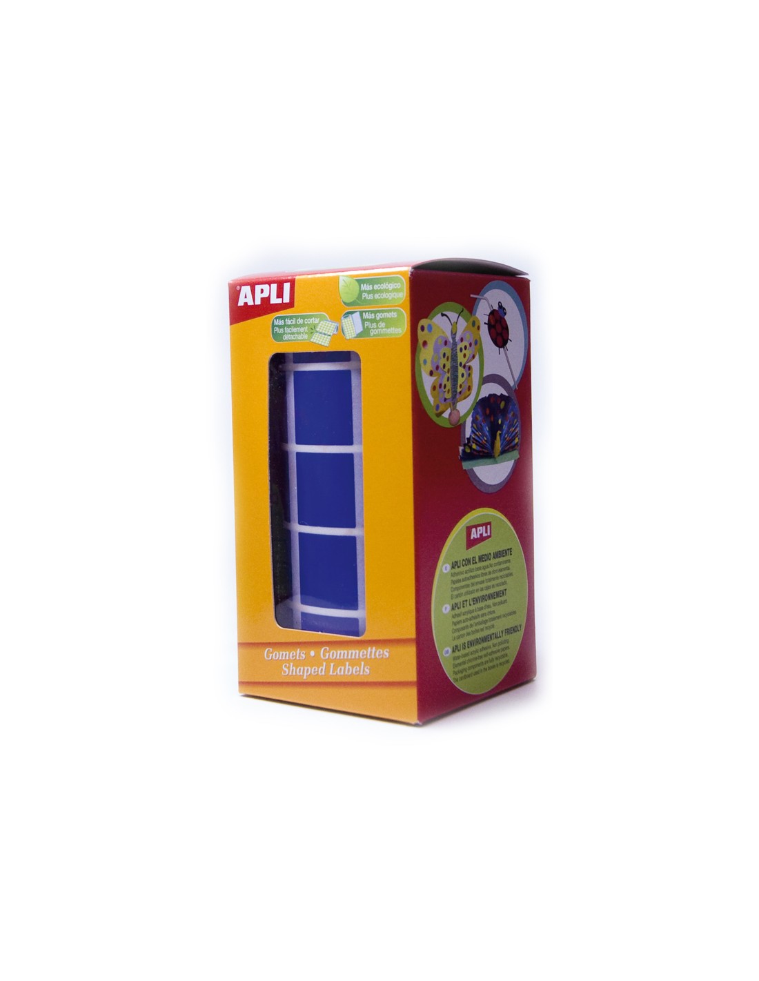 Etiquetas de diferentes formas y colores en rollo. Triángulos 20 x 20 x 20 mm. Cantidad por rollo 2832 gomets. Cuadrados 20 x 20 mm. Redondos 20 mm de diámetro. Cantidad por rollo 1770 gomets.