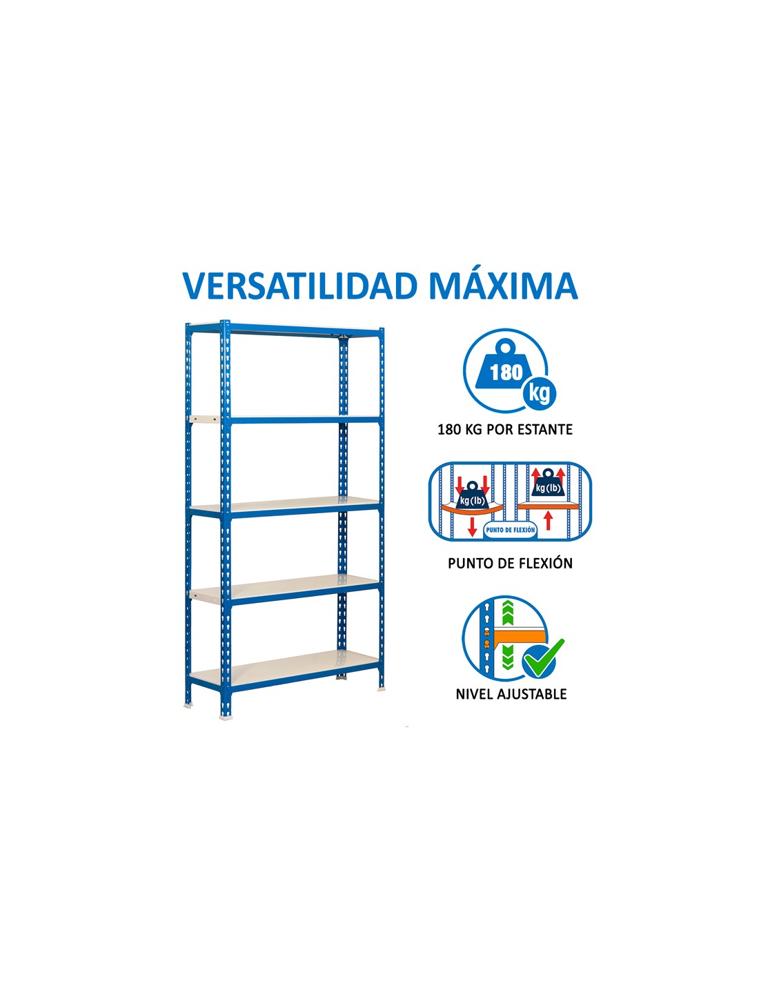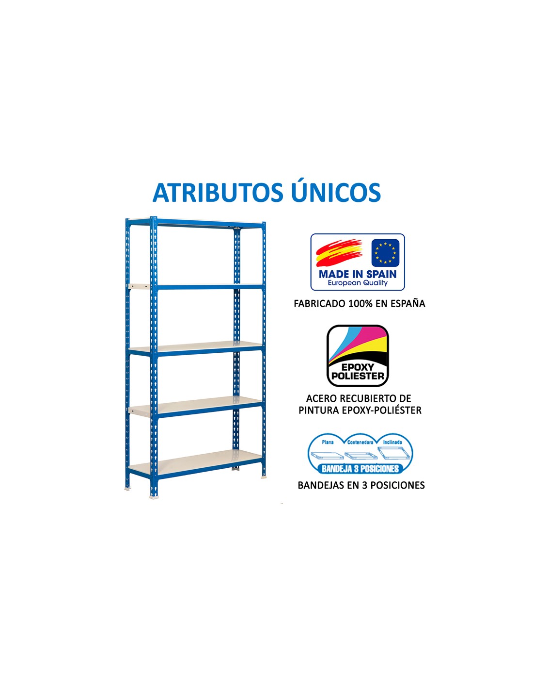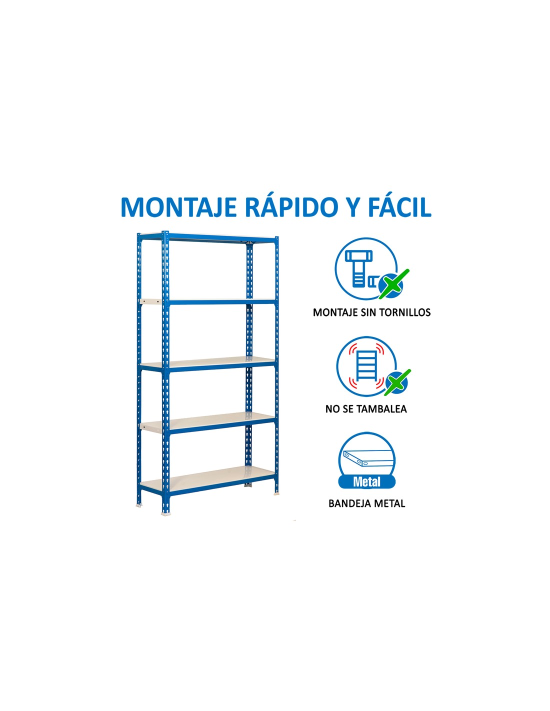 Estantería metálica sin tornillos de color azul/blanco. Capacidad de cargapor estante 180 kg. Número de estantes 5. La única estantería que permi te poner las bandejas en tres posiciones diferentes. Producto español, calidad europea. Medidas (alto x ancho x fondo) 1800x800x400 mm.