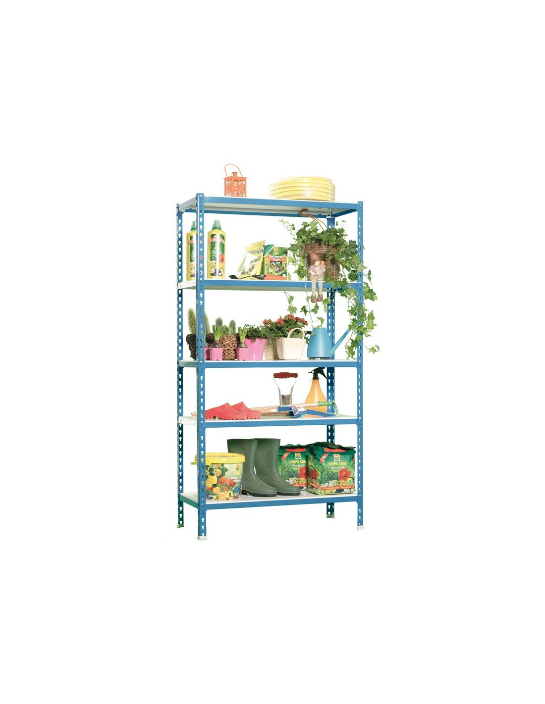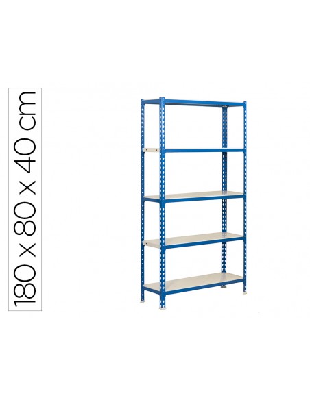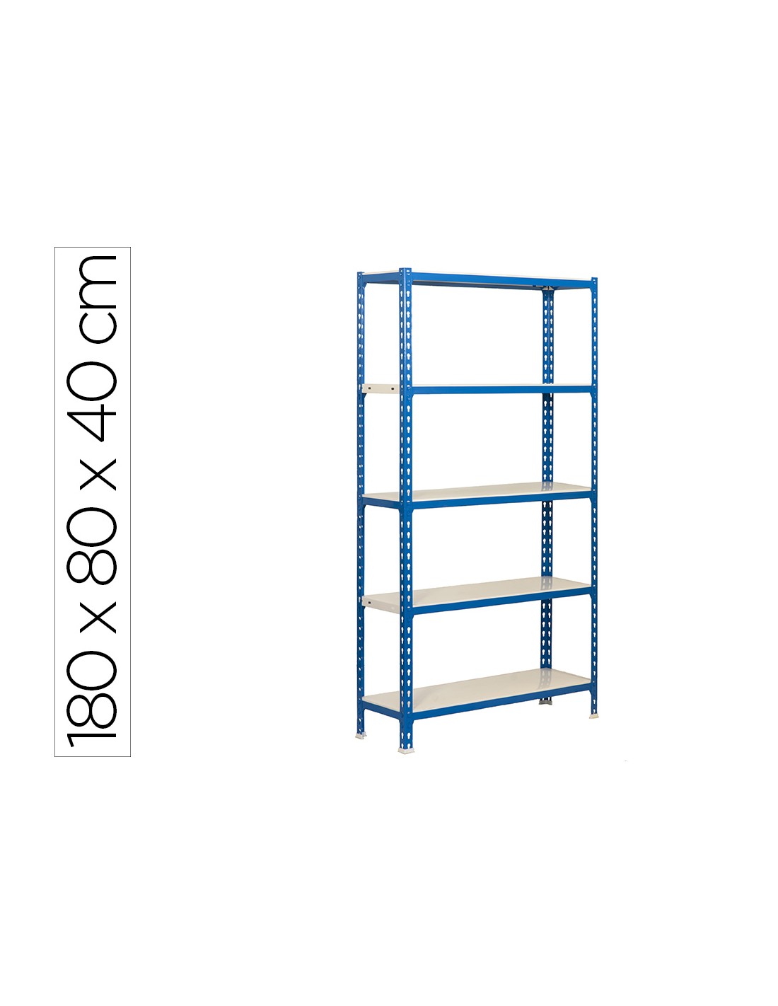 Estantería metálica sin tornillos de color azul/blanco. Capacidad de cargapor estante 180 kg. Número de estantes 5. La única estantería que permi te poner las bandejas en tres posiciones diferentes. Producto español, calidad europea. Medidas (alto x ancho x fondo) 1800x800x400 mm.