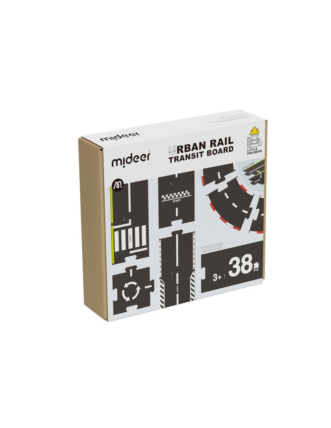 32 piezas de cartón en forma de puzzle, para la creación de circuitos. 6 señales de tráfico incluidas. Incluye guía con 9 circuitos diferentes para montar.