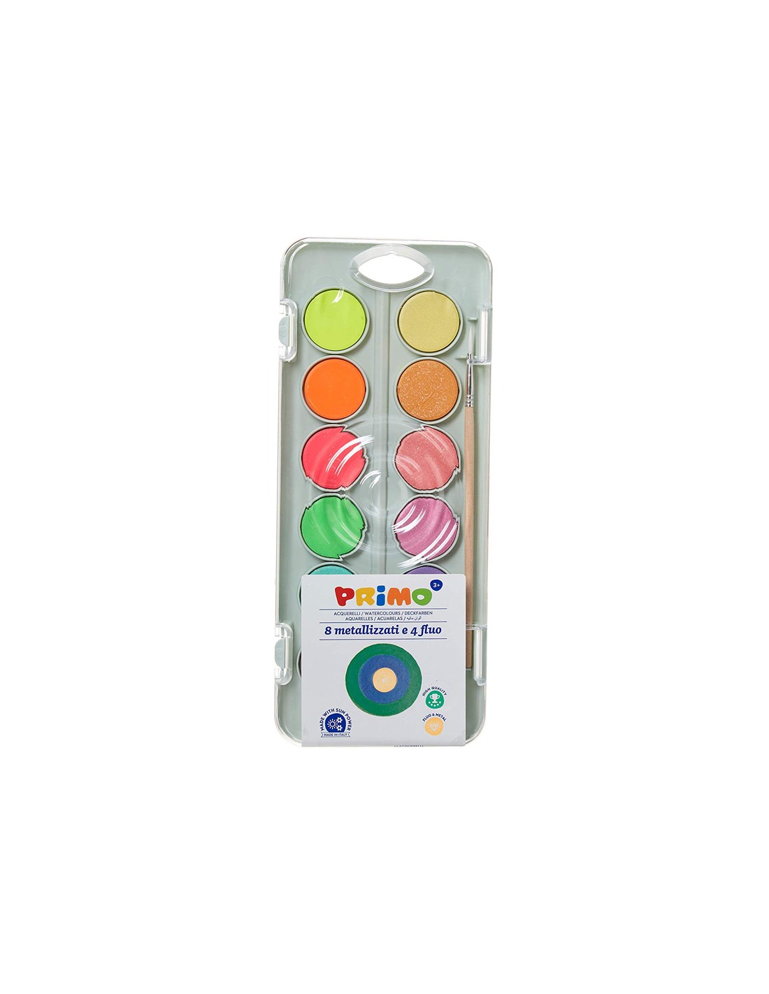 PRIMOAcuarela primo 8 colores metal + 4 colores neon con pincel y paleta de mezcla estuche de plastico