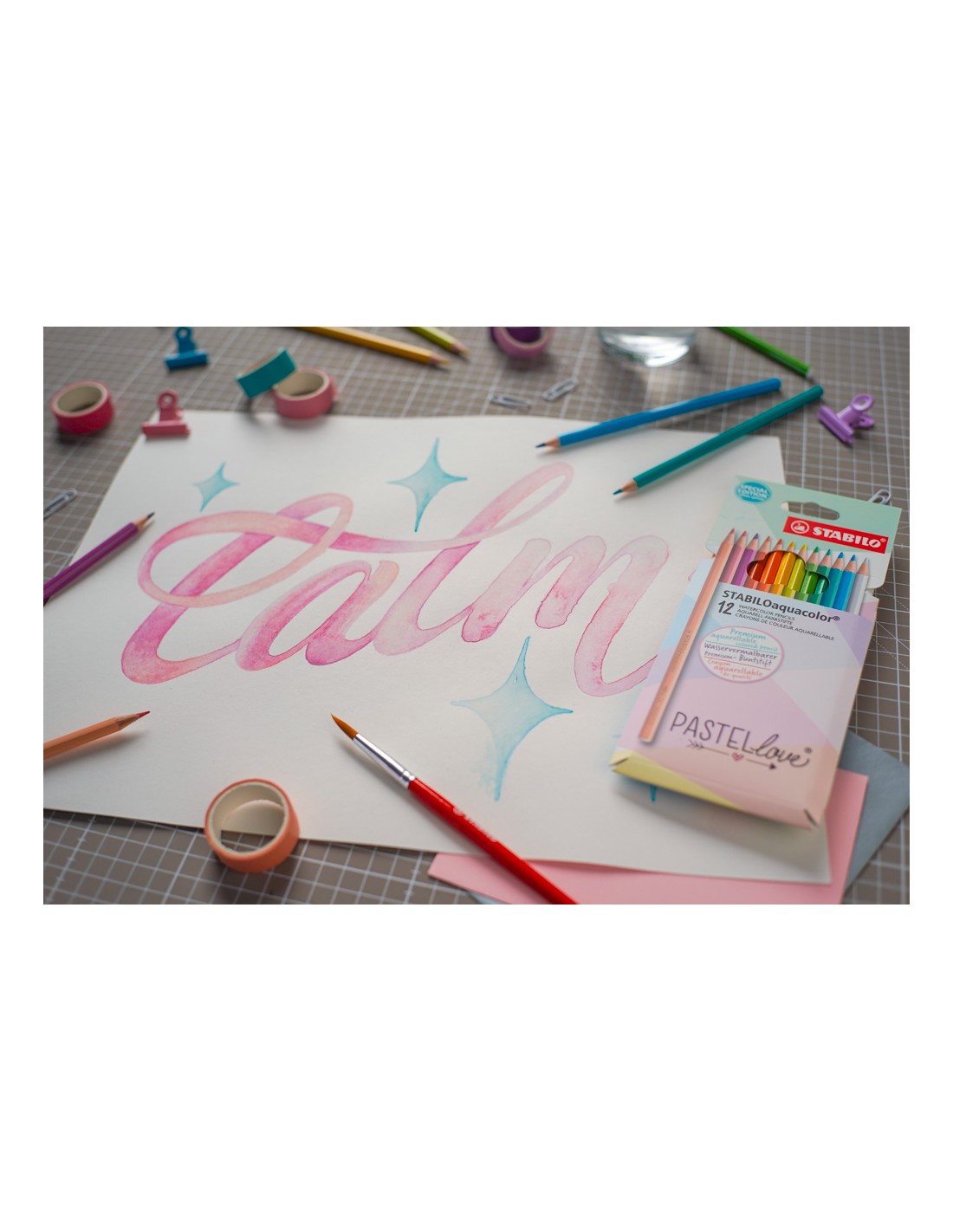 Estuche con 12 lápices de color acuarelable Stabilo Aquacolor Pastellove Collection. Lápiz de color acuarelable de alta calidad. Diámetro de mina 2,8 mm. Se pueden obtener efectos increíbles utilizando el lápiz con agua y un pincel.