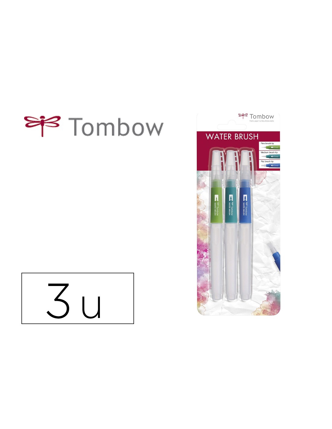 Pincel tombow water brush con deposito rellenable blister de 3 unidades punta fina/media/plana