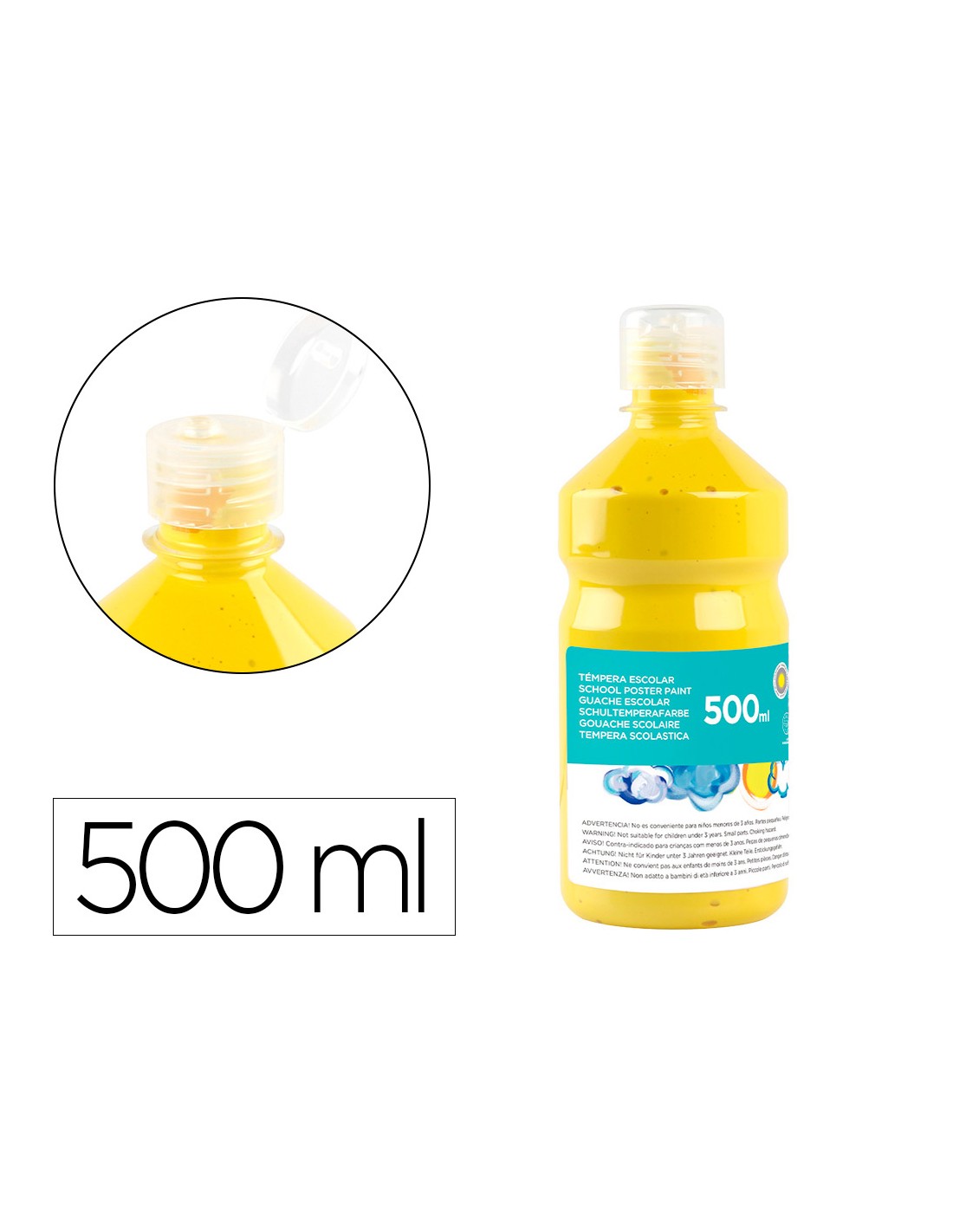 Témpera escolar. Ideal para uso escolar. Adecuada a partir de los 3 años de edad. Superlavable. Con cierre de seguridad. Colores brillantes. La botella de 500 ml.
