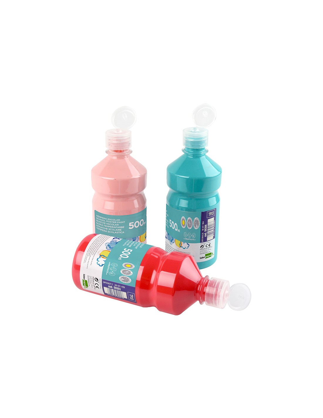 Témpera escolar. Ideal para uso escolar. Adecuada a partir de los 3 años de edad. Superlavable. Con cierre de seguridad. Colores brillantes. La botella de 500 ml.