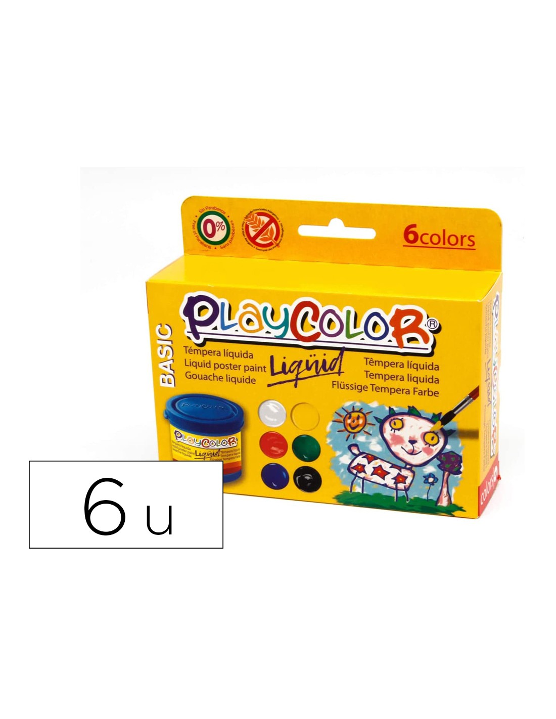 Estuche con 6 tarros 40 ml de pintura témpera líquida (6 colores básicos surtidos). De Playcolor, garantía de calidad para hacer manualidades. Pintura sin disolventes. Sin parabenos, ni lo principales alérgenos. A partir de 3 años. Tarros con tapa de colores, fáciles de guardar. No ondula el papel. Gran viscosidad. Alta opacidad.