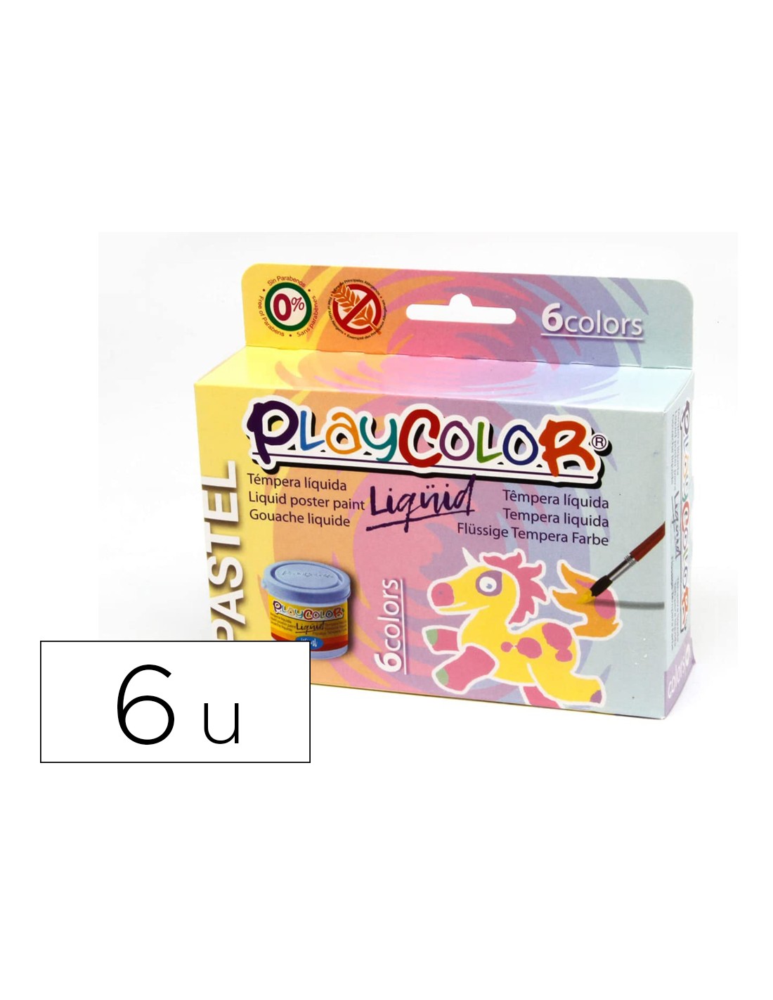 Estuche con 6 tarros 40 ml de pintura témpera líquida (6 colores pastel surtidos). De Playcolor, garantía de calidad para hacer manualidades. Pintura sin disolventes. Sin parabenos, ni lo principales alérgenos. A partir de3 años. Tarros con tapa de colores, fáciles de guardar. No ondula el pape l. Gran viscosidad. Alta opacidad.