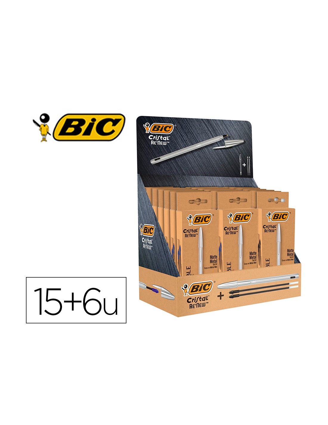 Boligrafo bic cristal renew 21 expositor 15 unidades azul + 6 negro regalo 50 bic cristal azul