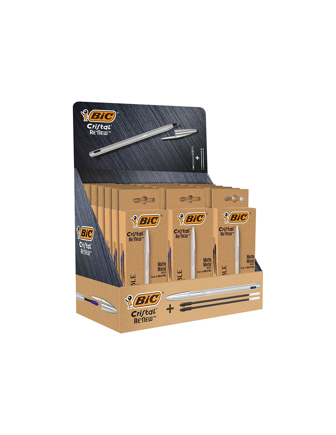 EXPOSITOR COMPUESTOS POR 21 ESTUCHES DE BOLIGRAFO METALICO + 2 RECARGAS. 15 ESTUCHES DE COLOR DE LA TINTA AZUL Y 6 ESTUCHES DE COLOR DE LA TINTA NEGRO.CUERPO METALICO COLOR MATE PARA UN ASPECTO ÚNICO Y ELEGANTE. CAPUCHON FABRICADO CON UN 96% DE PLASTICO RECARGABLE.EN UNA CAJA TIENES HASTA 9KM DE ESCRITURA.VERSION METALICA DEL ICÓNICO BIC CRISTAL.