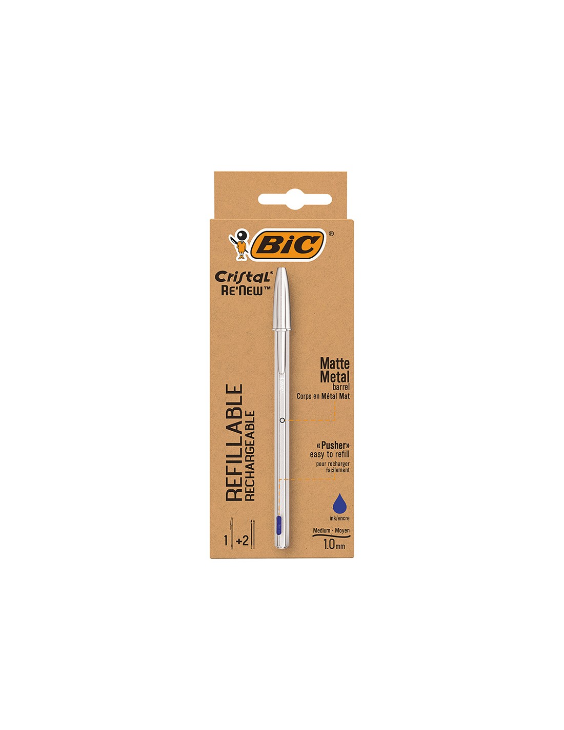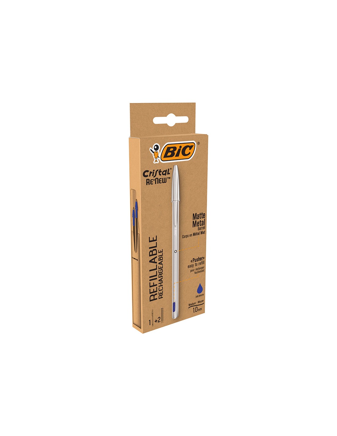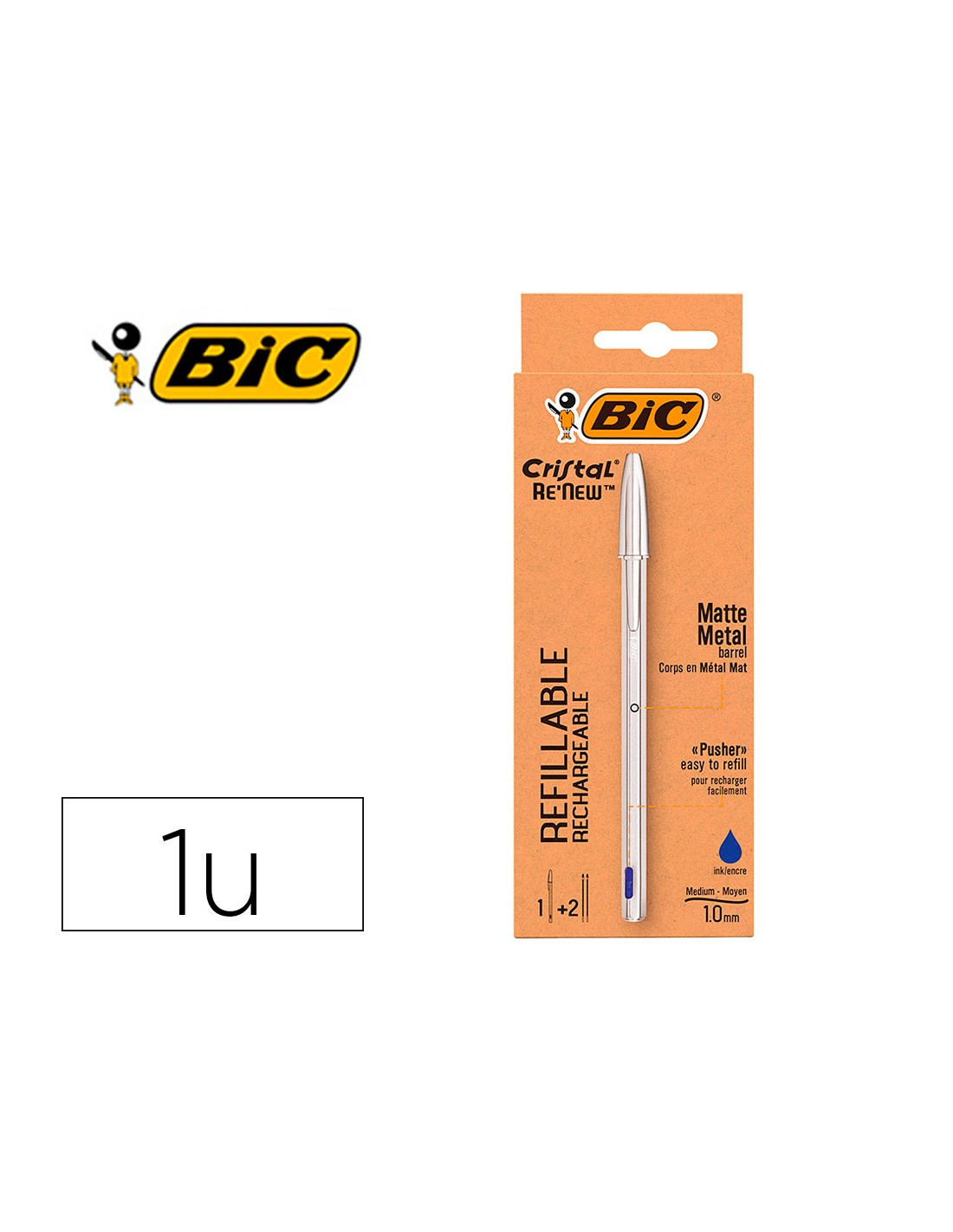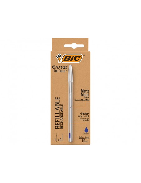Boligrafo bic cristal renew cuerpo en aluminio mate tinta azul + 2 recambios en caja de carton