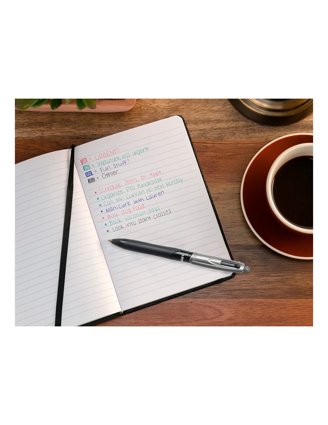 Bolígrafo 4 colores. Cuerpo fabricado con grip de caucho facilitando la escritura. Ergonómico. Sistema para correa. Garantiza 8 km de escritura entre los 4 colores. Punta de 1 mm. Trazo de 0,32 mm.