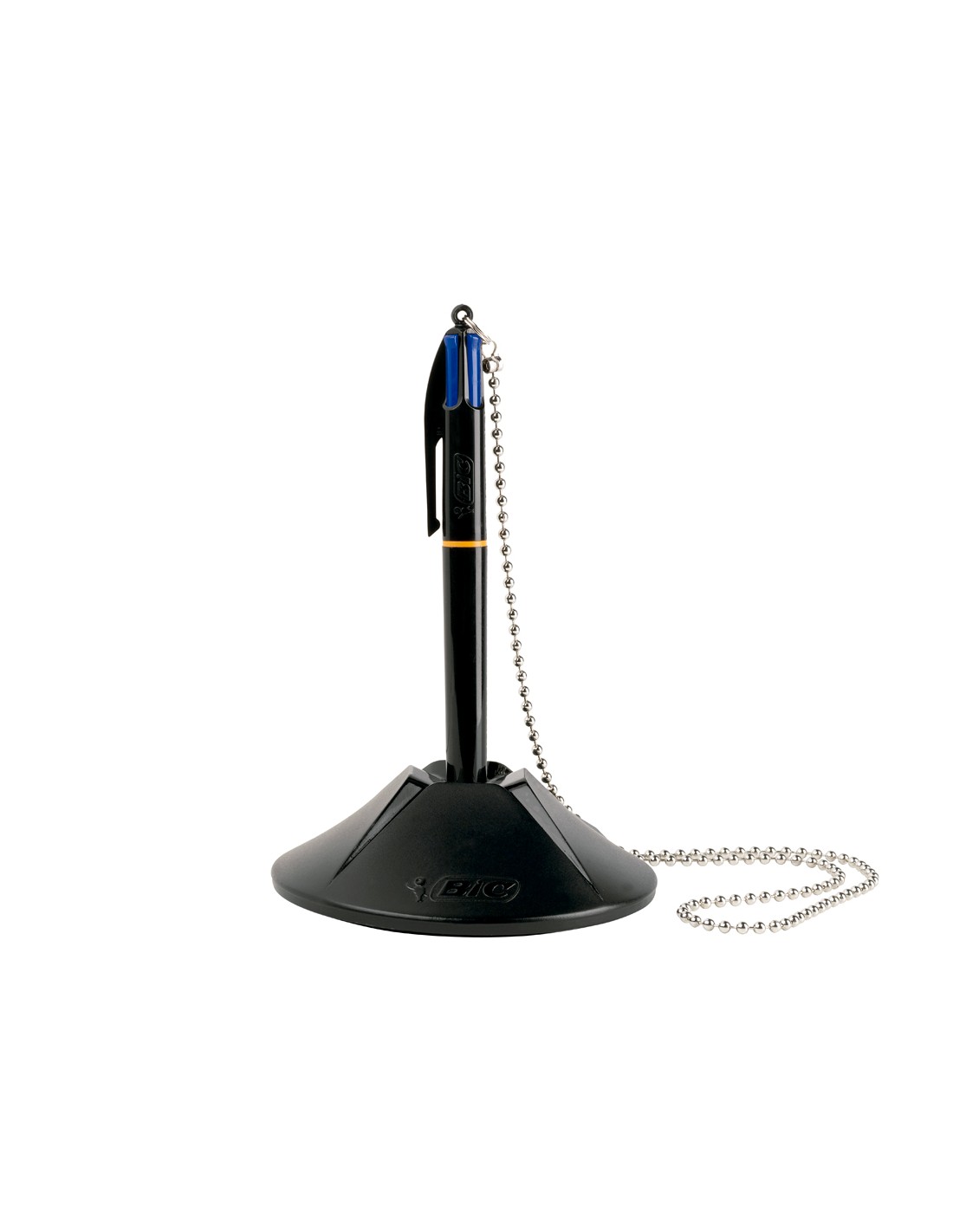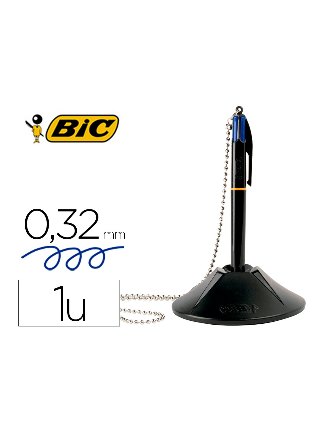 Ideal para mostradores y oficinas públicas. Bolígrafo retráctil 4 en 1 incluye 4 tintas azules para poder escribir más de 8 km entre los 4 colores. Con cadena metálica muy resistente. Peana de 250 g. Punta de 1 mm. Trazo de 0,32 mm.