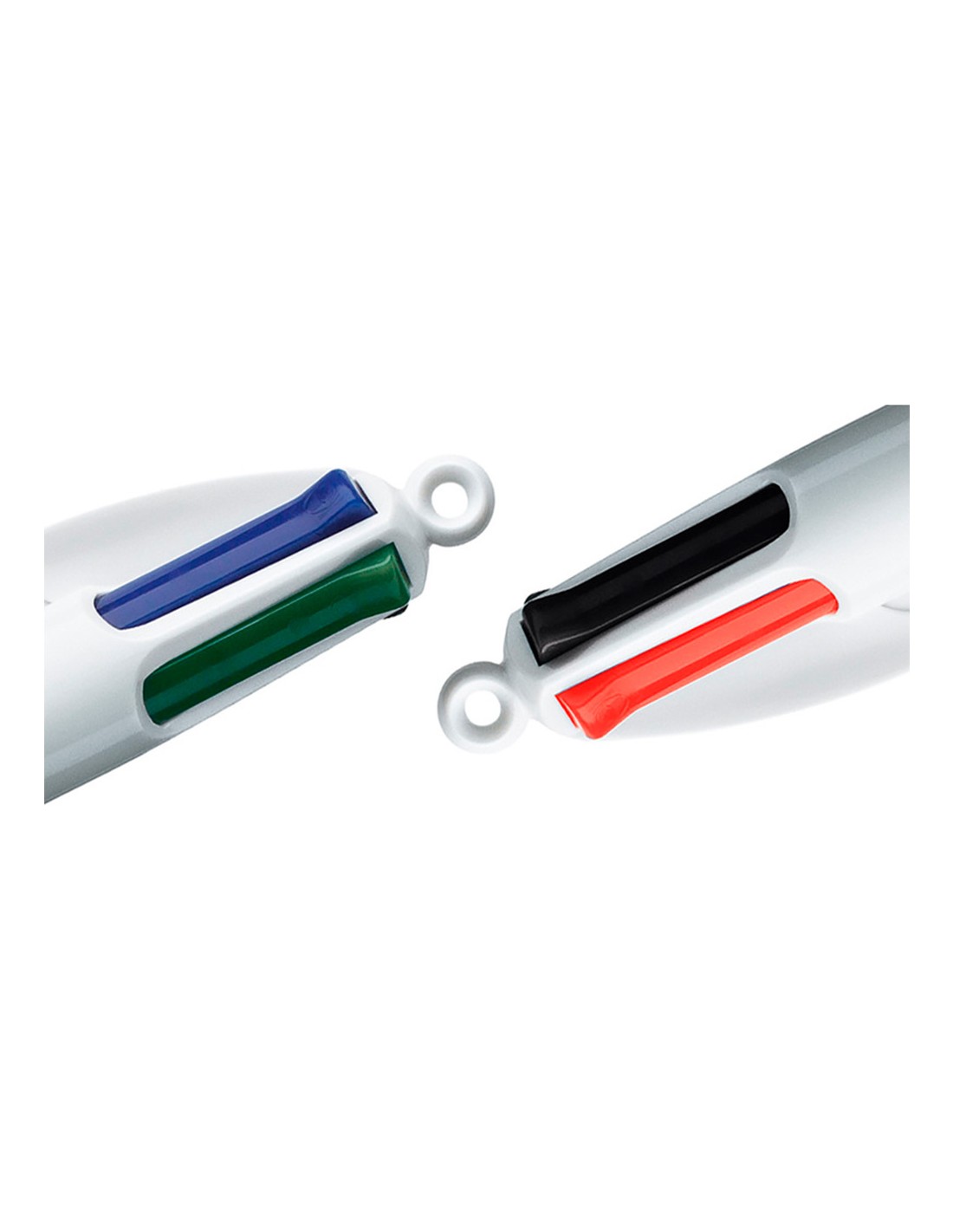 Bolígrafo 4 colores. Diseño moderno con cuerpo en colores metálicos surtidos. Permite corregir, marcar o diferenciar un texto con sólo pulsar el color de tinta elegido. Tinta de calidad, de secado rápido y una escritura suave. Sistema para correa. Producto libre de PVC. Punta media de 1 mm. Trazo 0,32 mm.