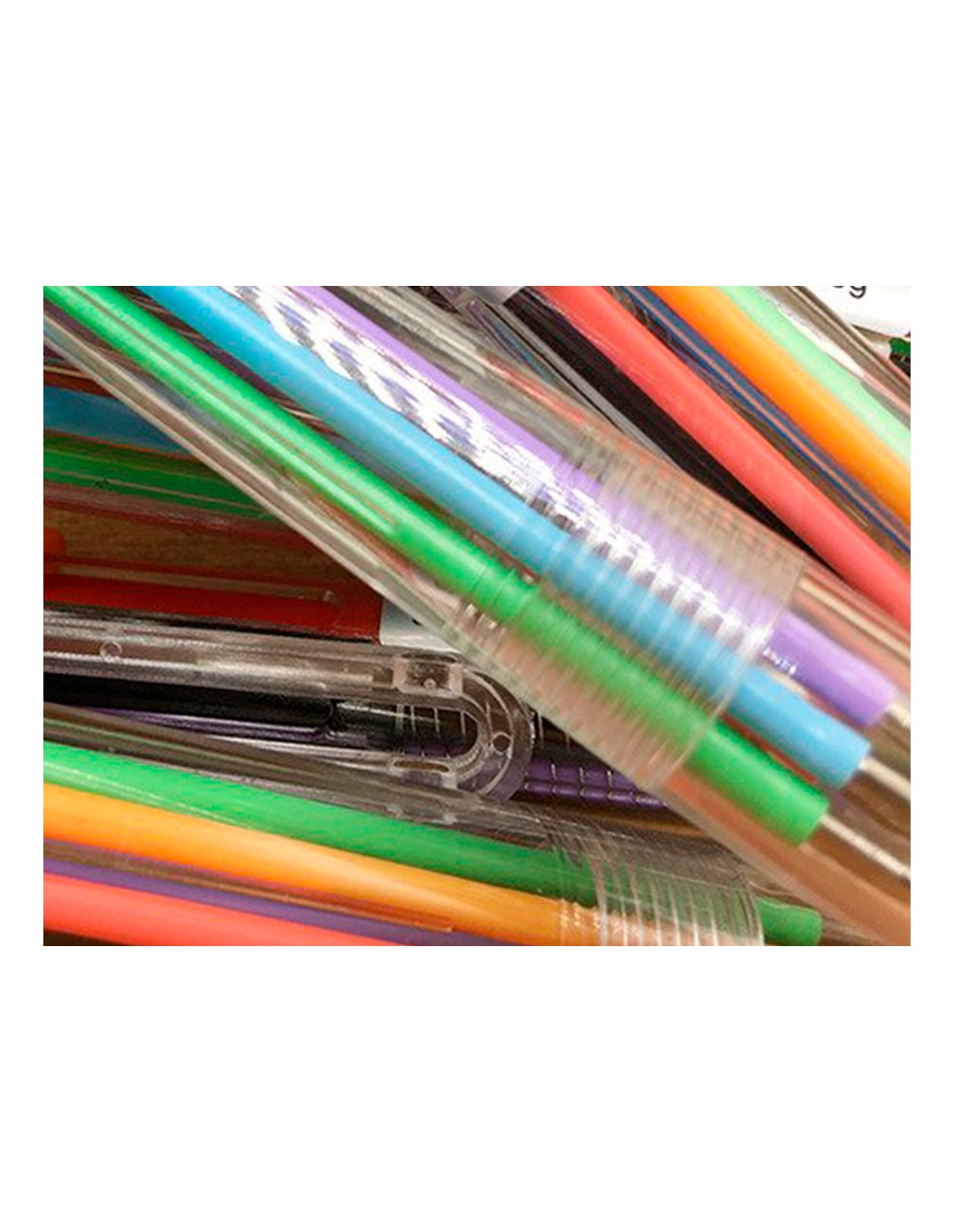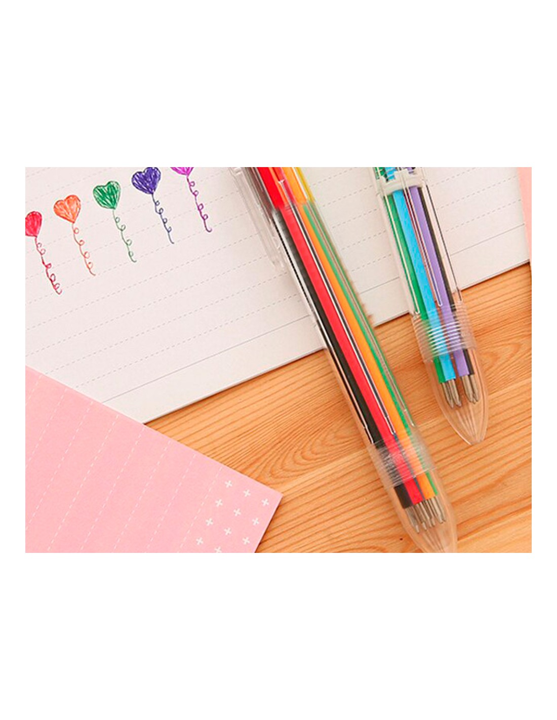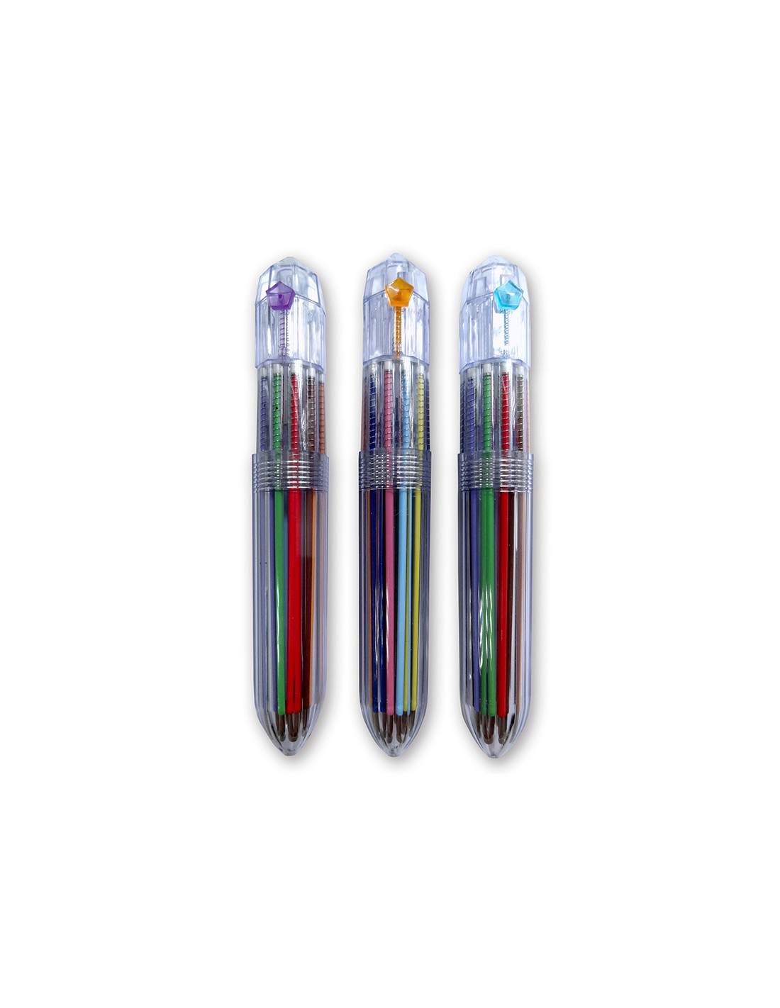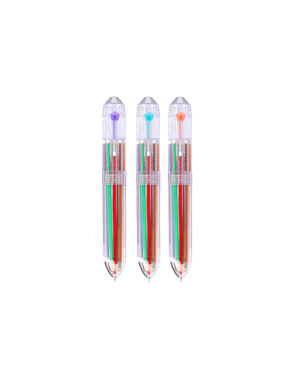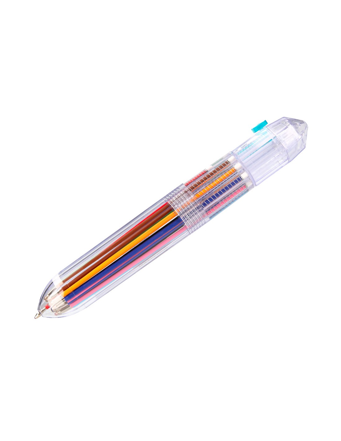 Bolígrafo retráctil multifunción con tinta a base de aceite. Completo sistema 10 en 1 con 10 colores de tinta (amarillo, azul, celeste, marrón, naranja, negro, rojo, rosa, verde y violeta). Cuerpo de plástico transparente. Punta de 1 mm. Trazo del bolígrafo de 0,7 mm.