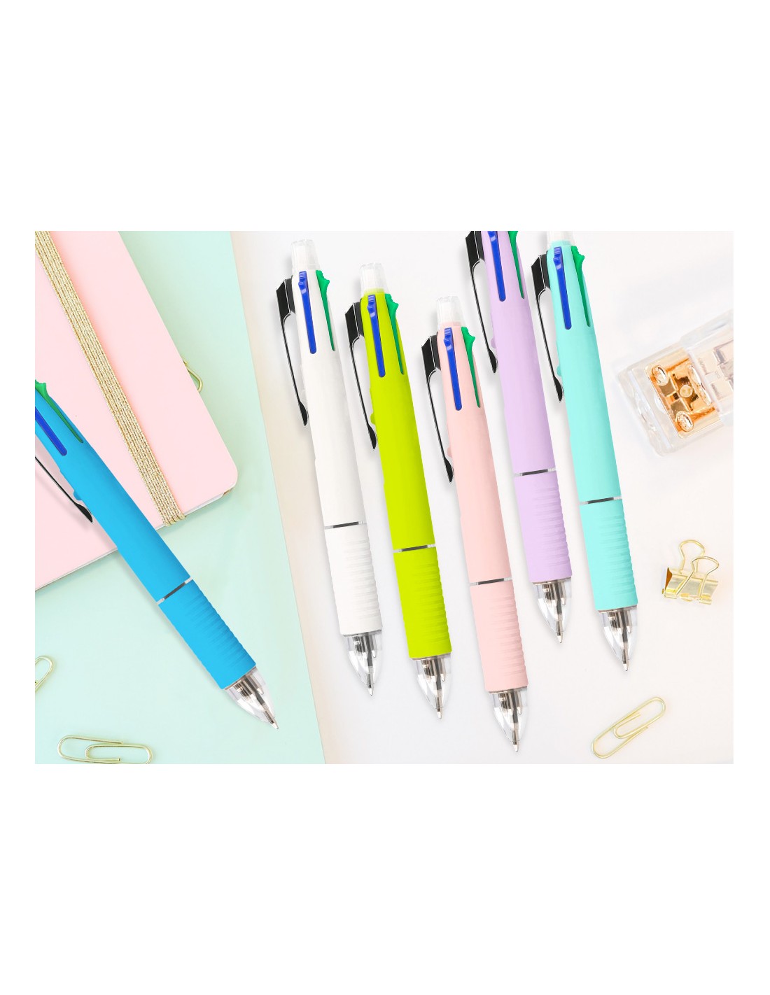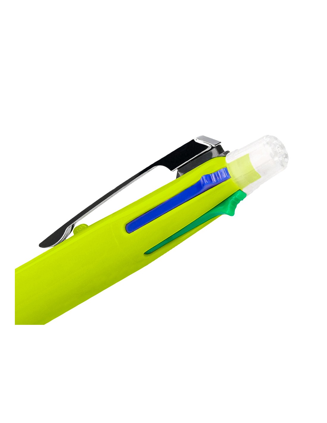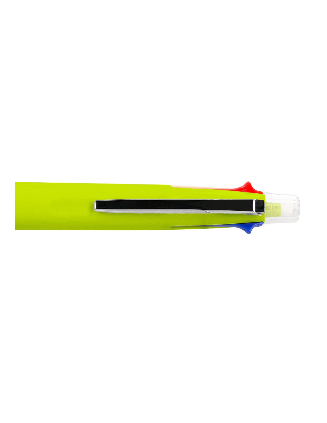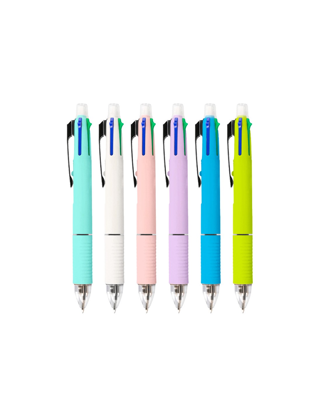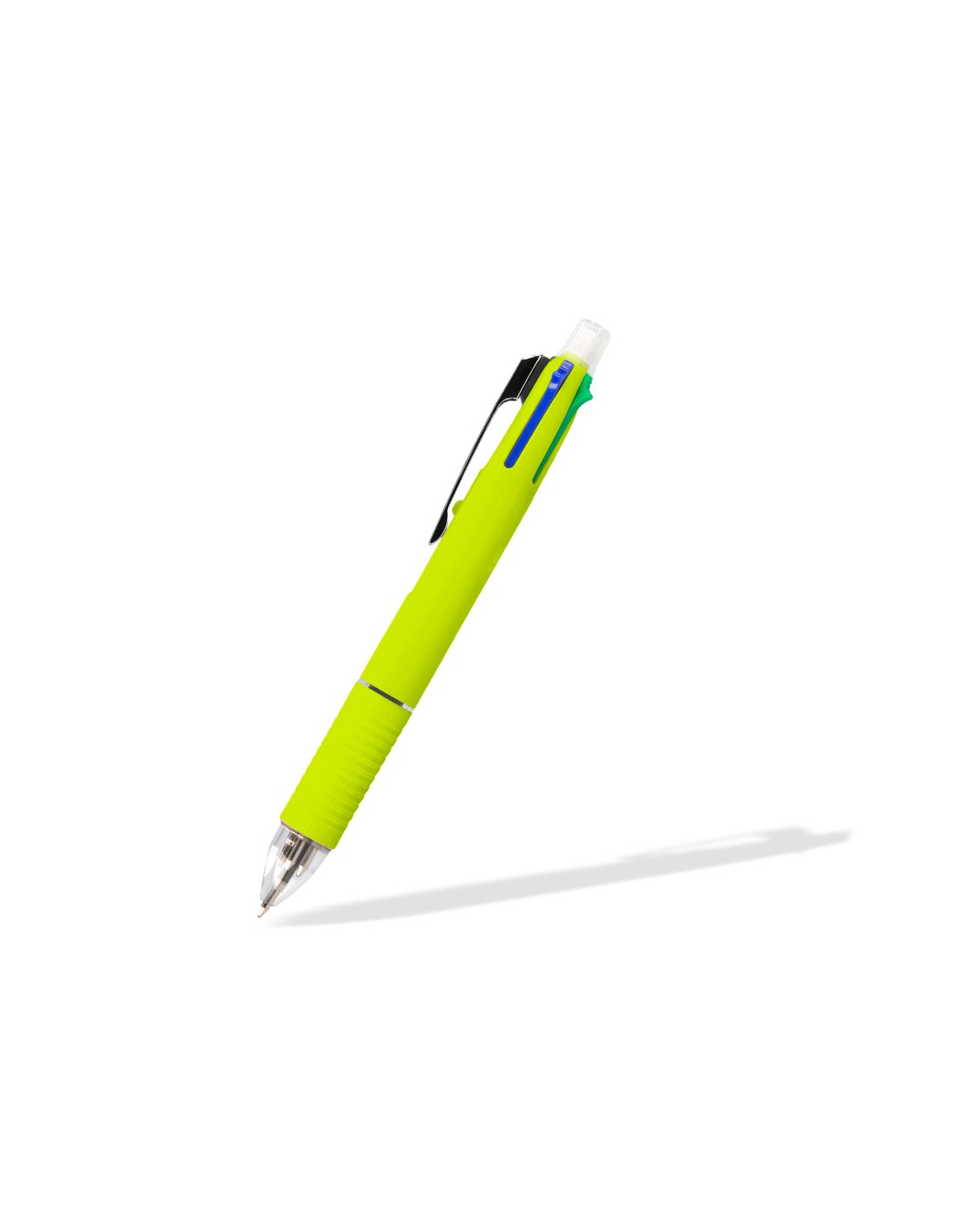 Bolígrafo retráctil multifunción con tinta a base de aceite. Completo sistema 5 en 1 con 4 colores de tinta (azul, negro, rojo y verde) y portaminas. Cuerpo de plástico en diferentes colores vivos y clip metálico. Grip de caucho en la parte inferior para una mayor comodidad en la escritura. Con goma de borrar protegida incluida en el pulsador. Punta de 1 mm. Trazo del bolígrafo de 0,7 mm. Trazo del portaminas de 0,5 mm.