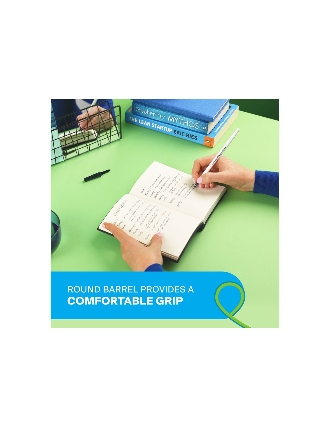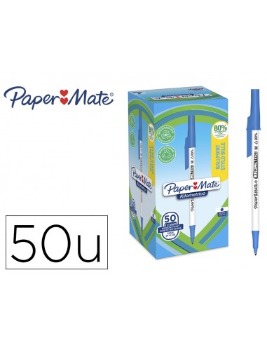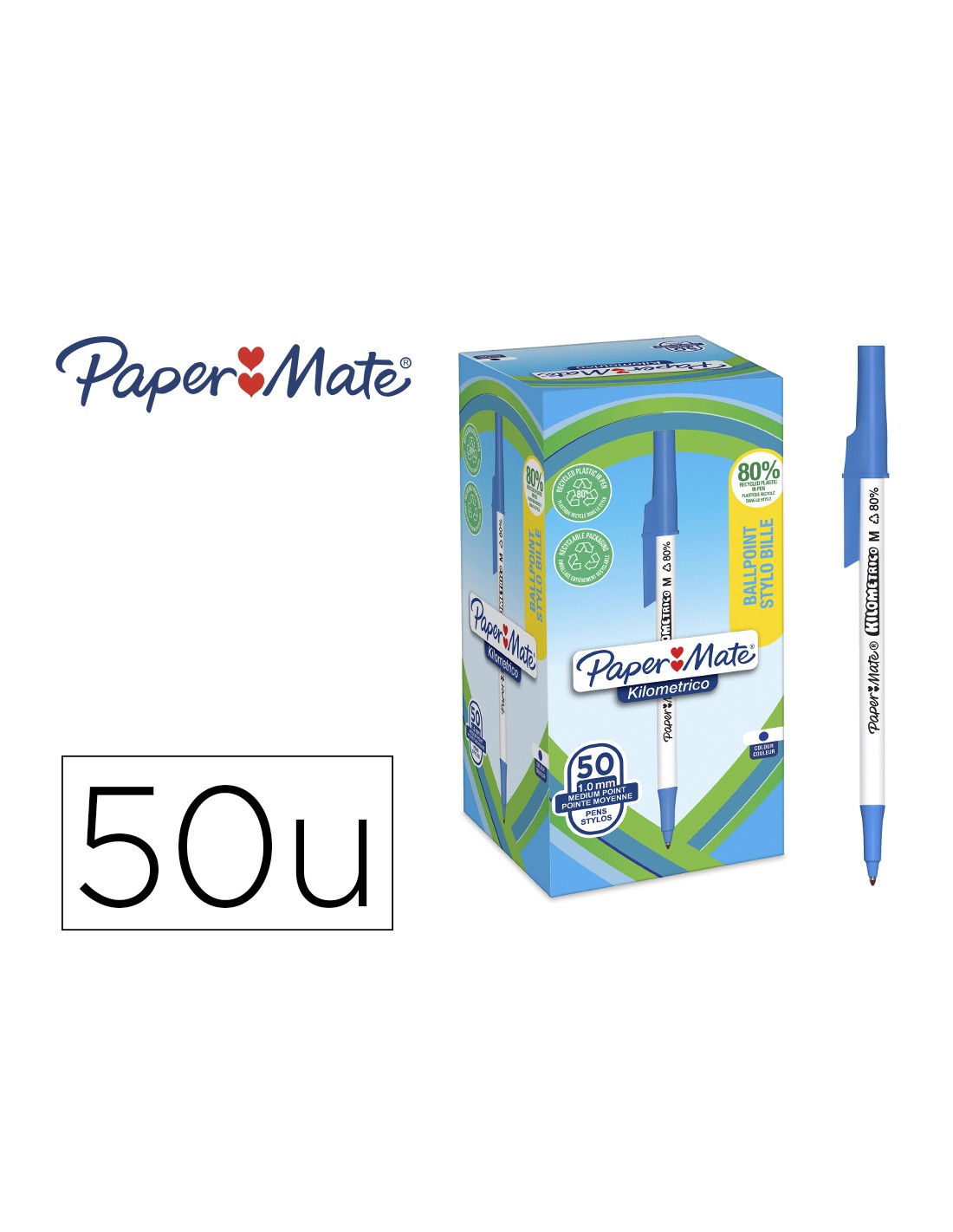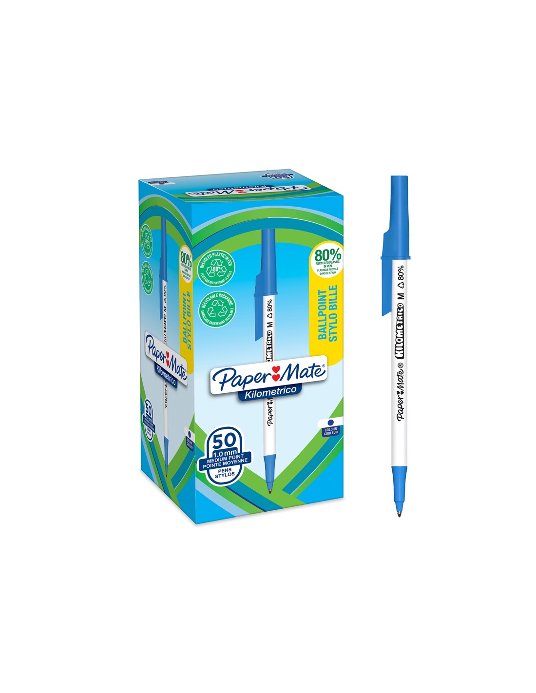 Bolígrafos Paper Mate Kilométrico. Escritura Larga con punta mediana (1,0 mm). Tinta azul. 80% plástico reciclado. Caja 50 unidades. Fabricados en un 80% con plásticos reciclados, los bolígrafos Paper Mate Kilométrico ofrecen una escritura fiable y suave y son ideales para todo tipo de situaciones de escritura. Disponibles en tinta negra, azul y roja con una punta mediana de 1,0 mm, la tinta fuerte destaca para causar una impresión firme y profesional.