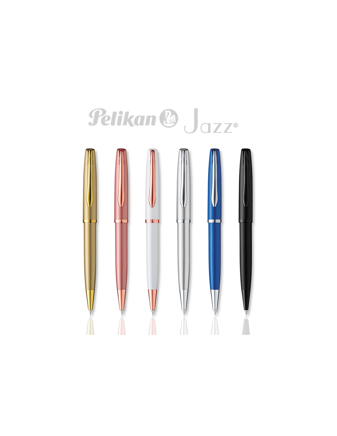 Expositor 12 unidades bolígrafo Jazz Noble. Bolígrafo de metal con diseño moderno y elegante. Mecanismo de giro. Repuesto universal con tinta de color azul. Punto mediano con ancho de trazo de 1mm. 6 colores surtidos Negro, Oro, Perla, Plata, Rosa y Zafiro.