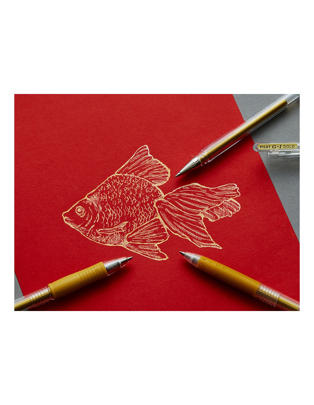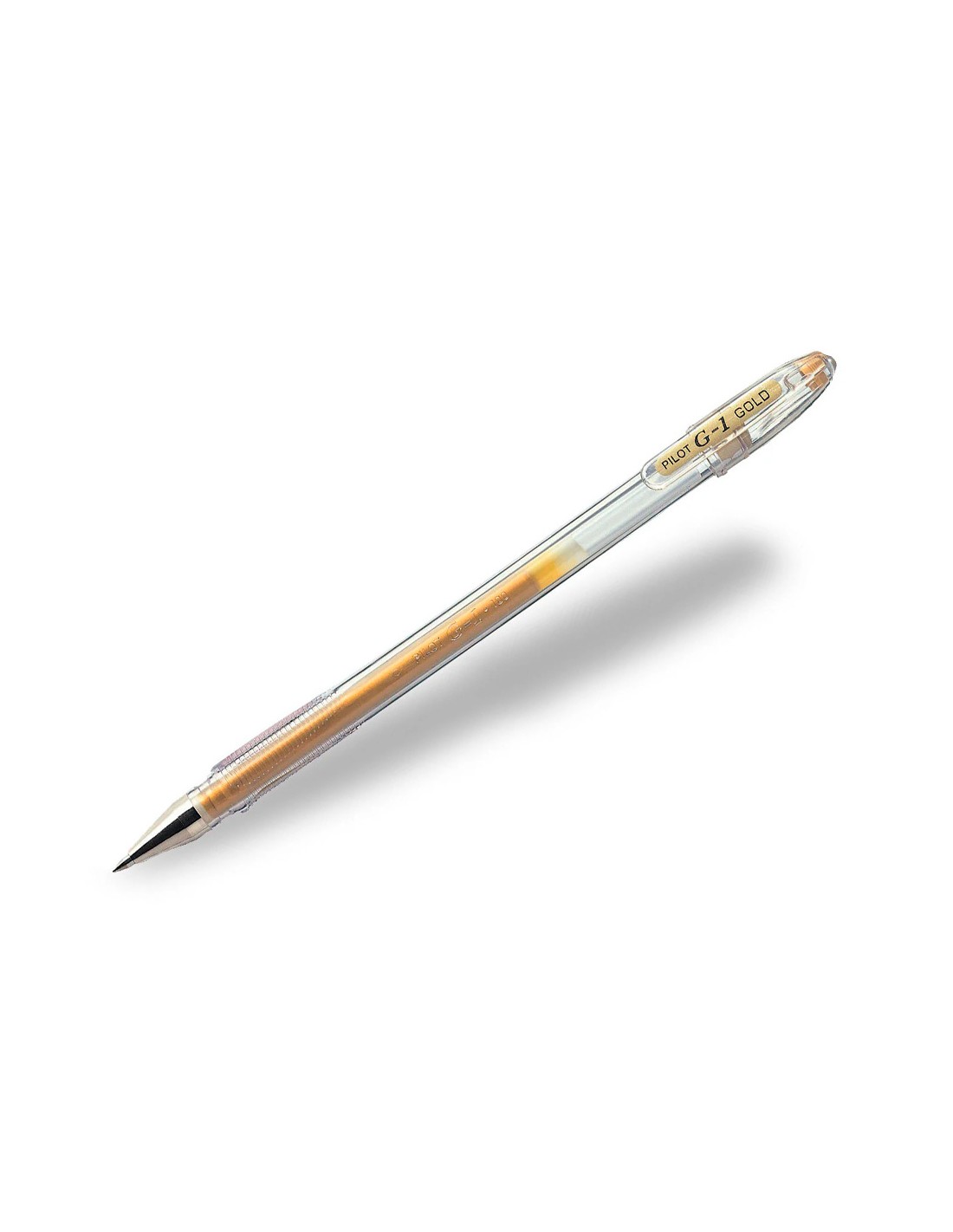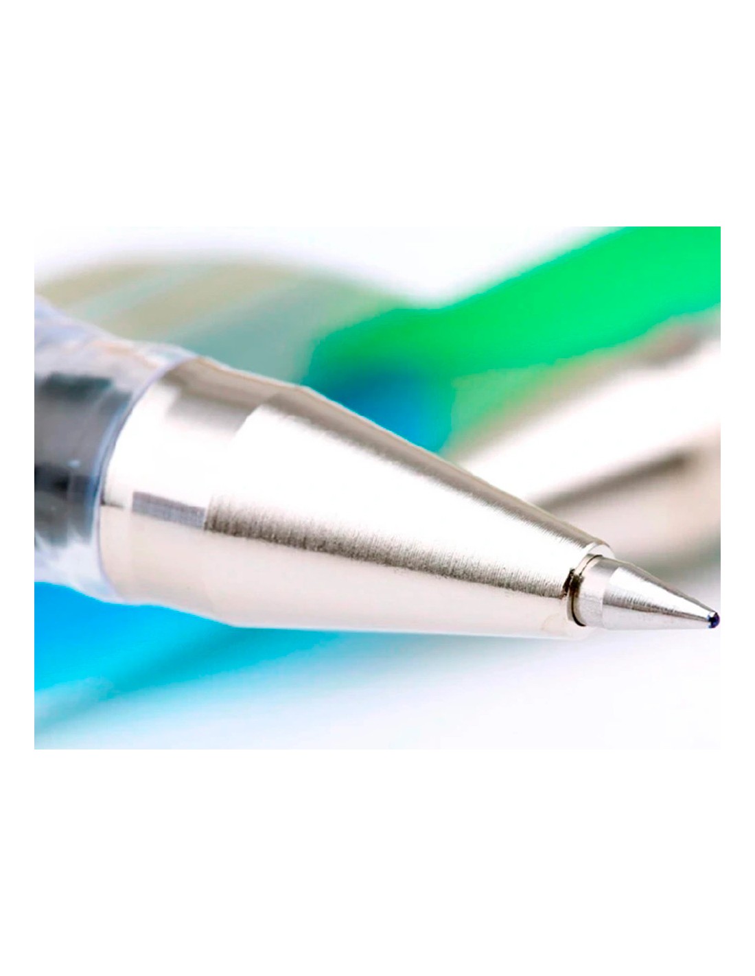 Bolígrafo con tinta gel pigmentada. Cuerpo transparente que permite ver elnivel de la tinta. Punta de bola de acero inoxidable. Punta de 0,5 mm. Tr azo de 0,3 mm. Color oro.