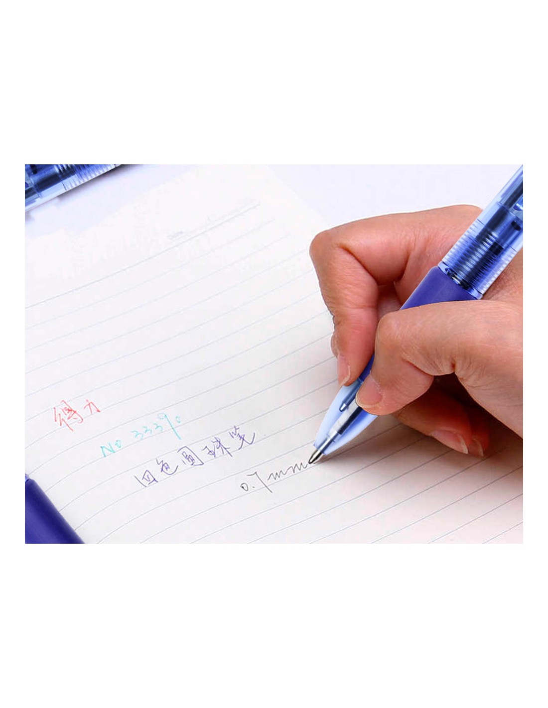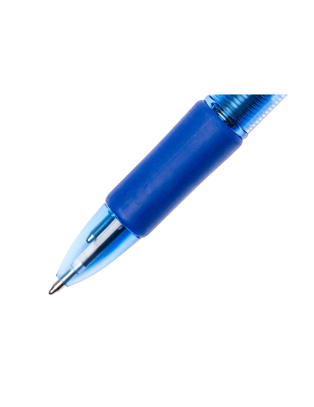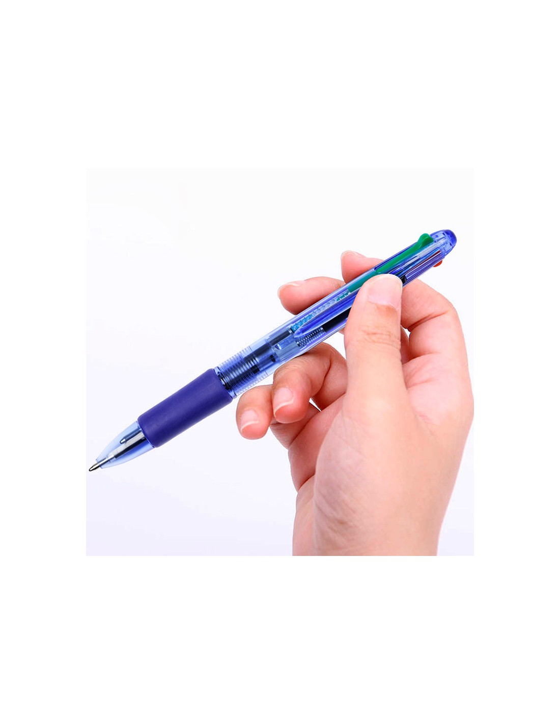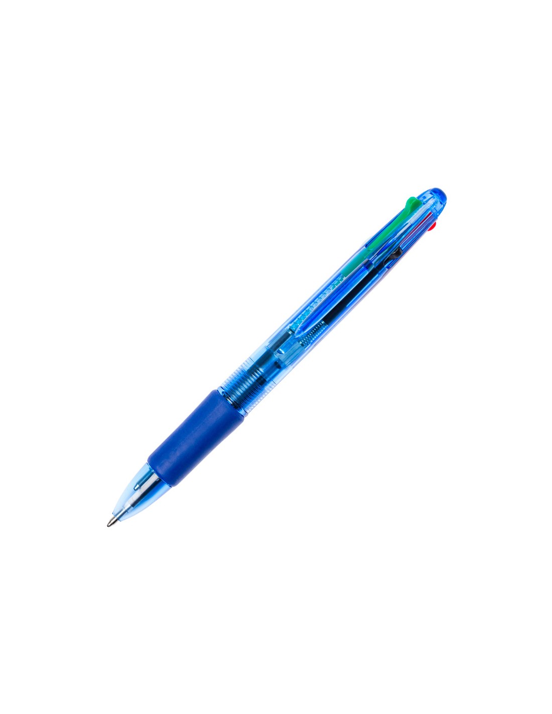 Bolígrafo retráctil 4 en 1. Escribe en azul, negro, rojo y verde. De cuerpo azul semitransparente. Cómoda sujeción de caucho azul. Punta de 1 mm. Trazo de 0,7 mm.