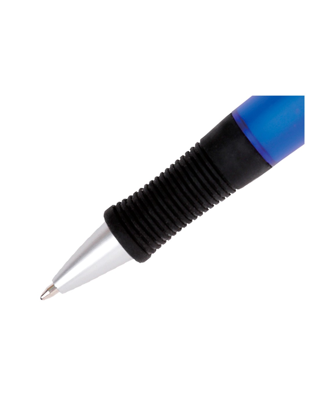 Bolígrafo retráctil con sujeción de caucho. Cuerpo ergonómico de ABS y agarre antideslizante de caucho para mayor comodidad. Clip hecho de material reciclable. Tinta azul a base de aceite. Punta de 1 mm. Trazo de 0,7 mm.