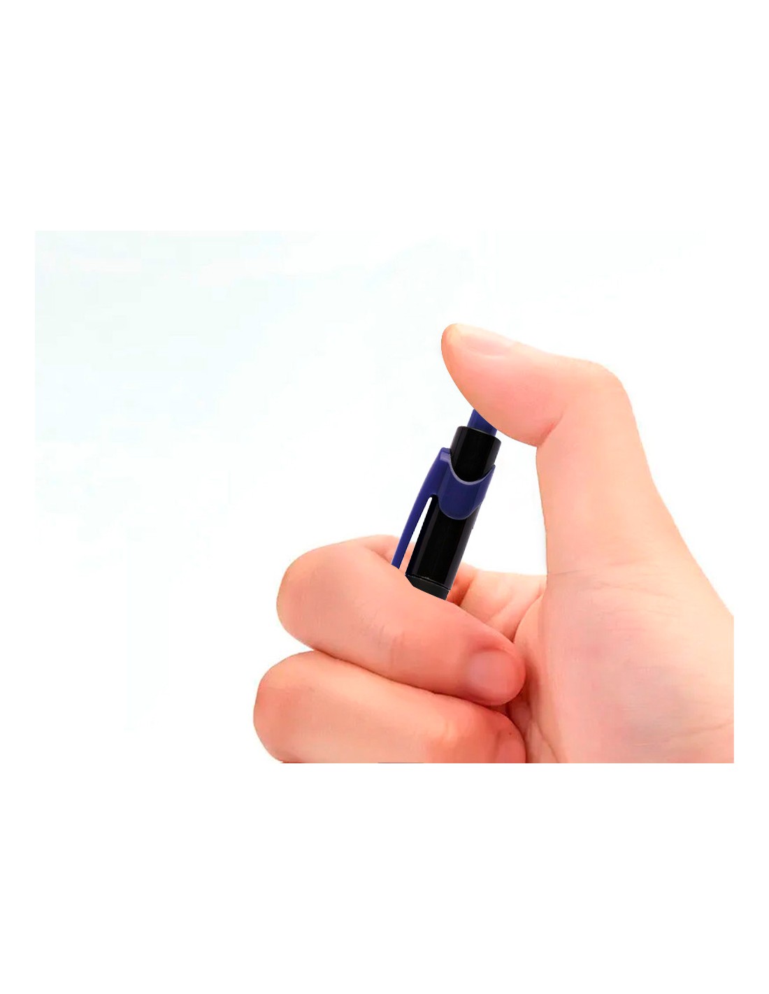 Bolígrafo retráctil con tinta de aceite y cuerpo recubierto de goma para una escritura cómoda. Estrías antideslizantes para una mayor sujeción. Con punta metálica. Tinta del color del clip. Punta de 0,7 mm. Trazo de 0,5 mm.