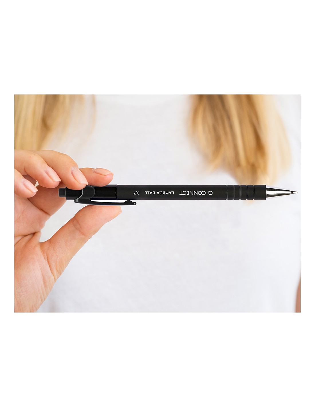 Bolígrafo retráctil con tinta de aceite y cuerpo recubierto de goma para una escritura cómoda. Estrías antideslizantes para una mayor sujeción. Con punta metálica. Tinta del color del clip. Punta de 0,7 mm. Trazo de 0,5 mm.