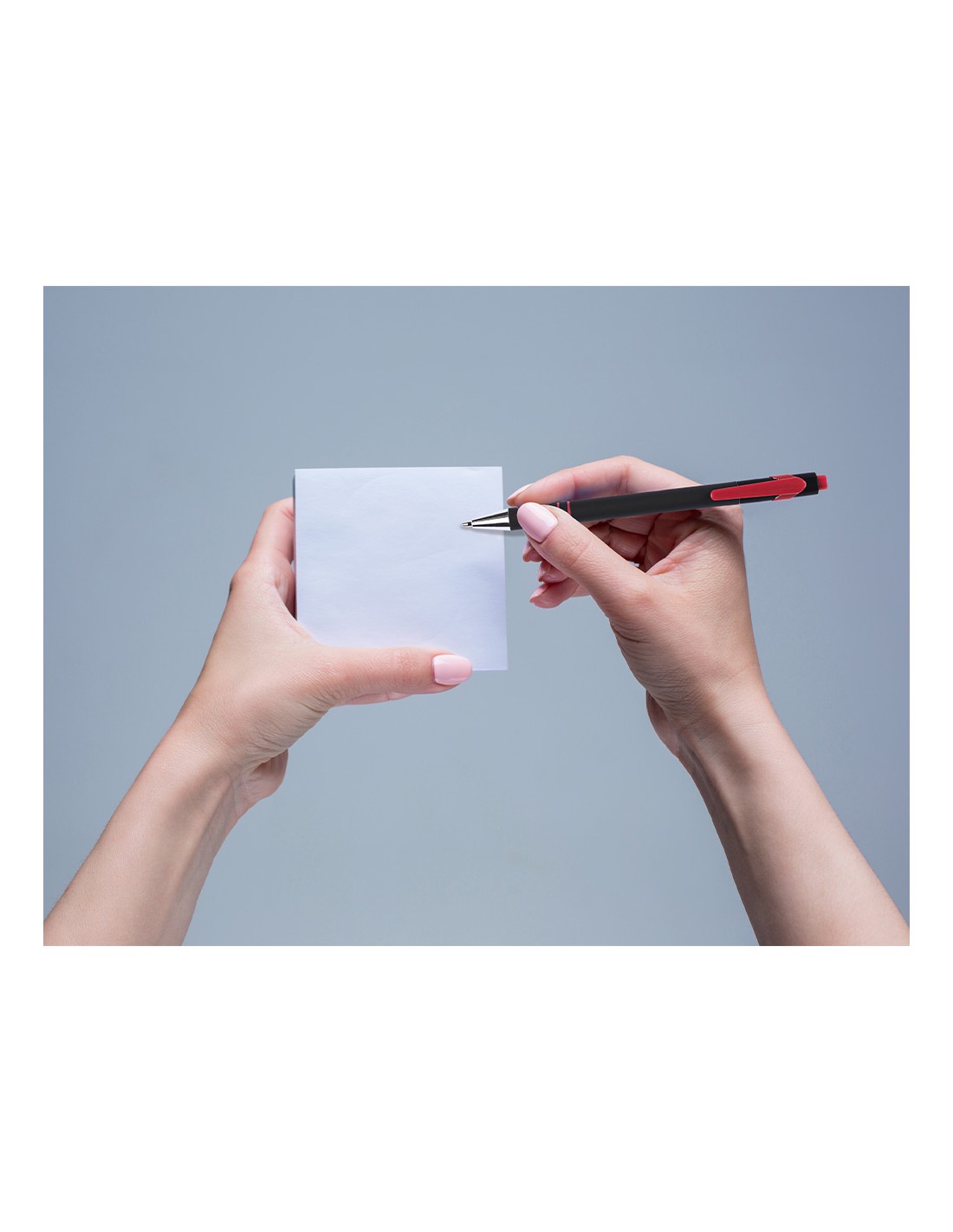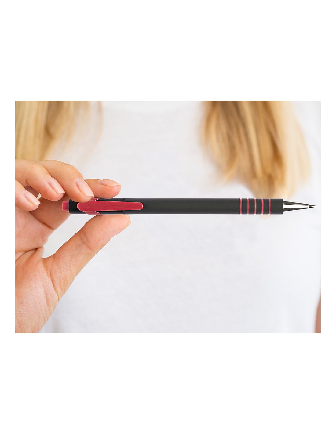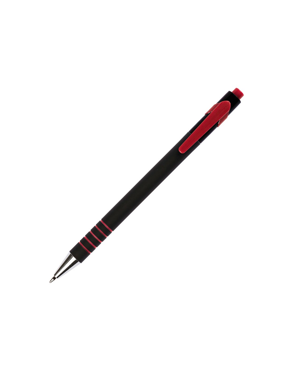 Bolígrafo retráctil con tinta de aceite y cuerpo recubierto de goma para una escritura cómoda. Estrías antideslizantes para una mayor sujeción. Con punta metálica. Tinta del color del clip. Punta de 0,7 mm. Trazo de 0,5 mm.
